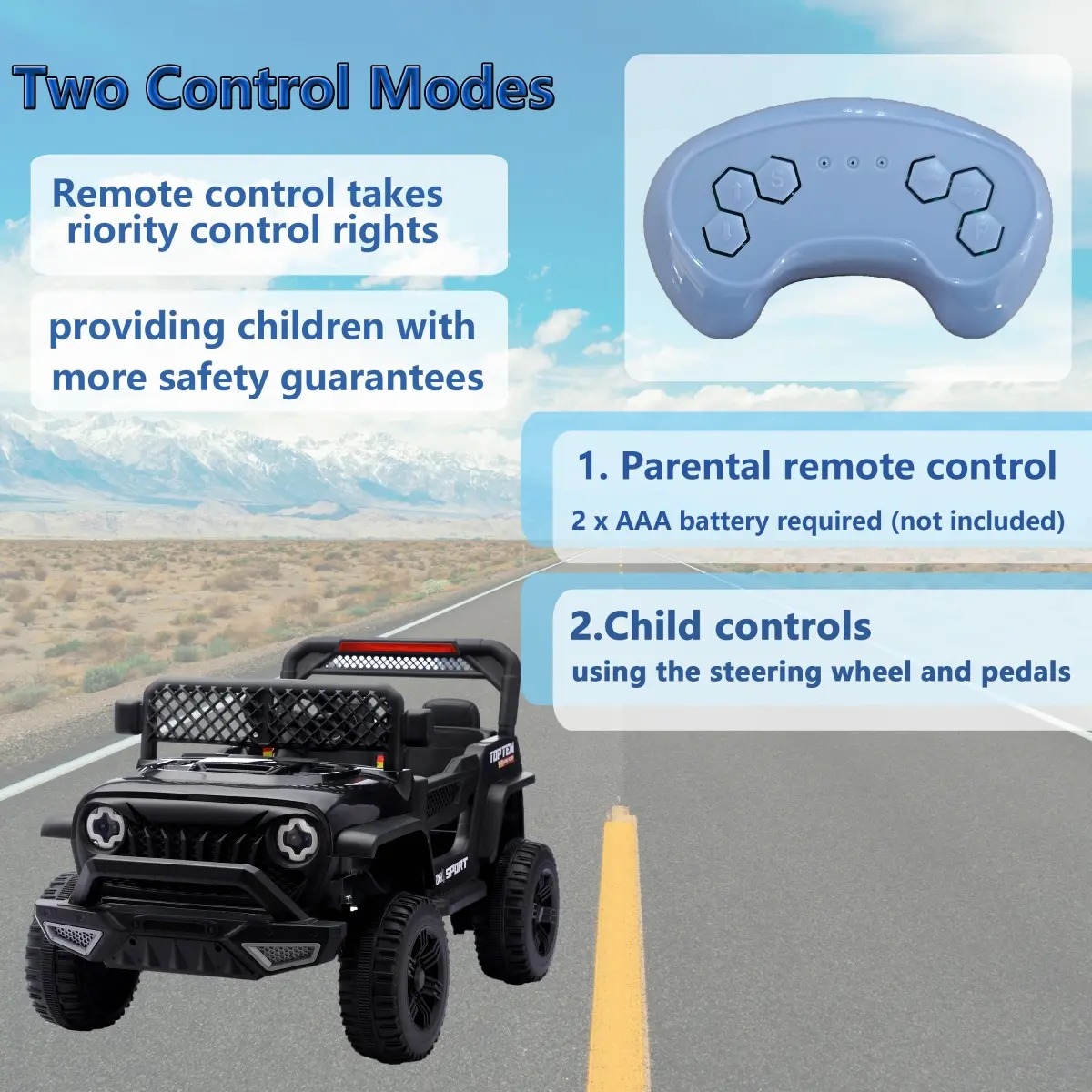 ·Dual Control Modes for Parental Peace of MindSwitch between parental 2.4GHz remote control (for young toddlers) and manual foot pedal/steering wheel operation (for independent kids).Remote takes priority in manual mode for ultimate safety.