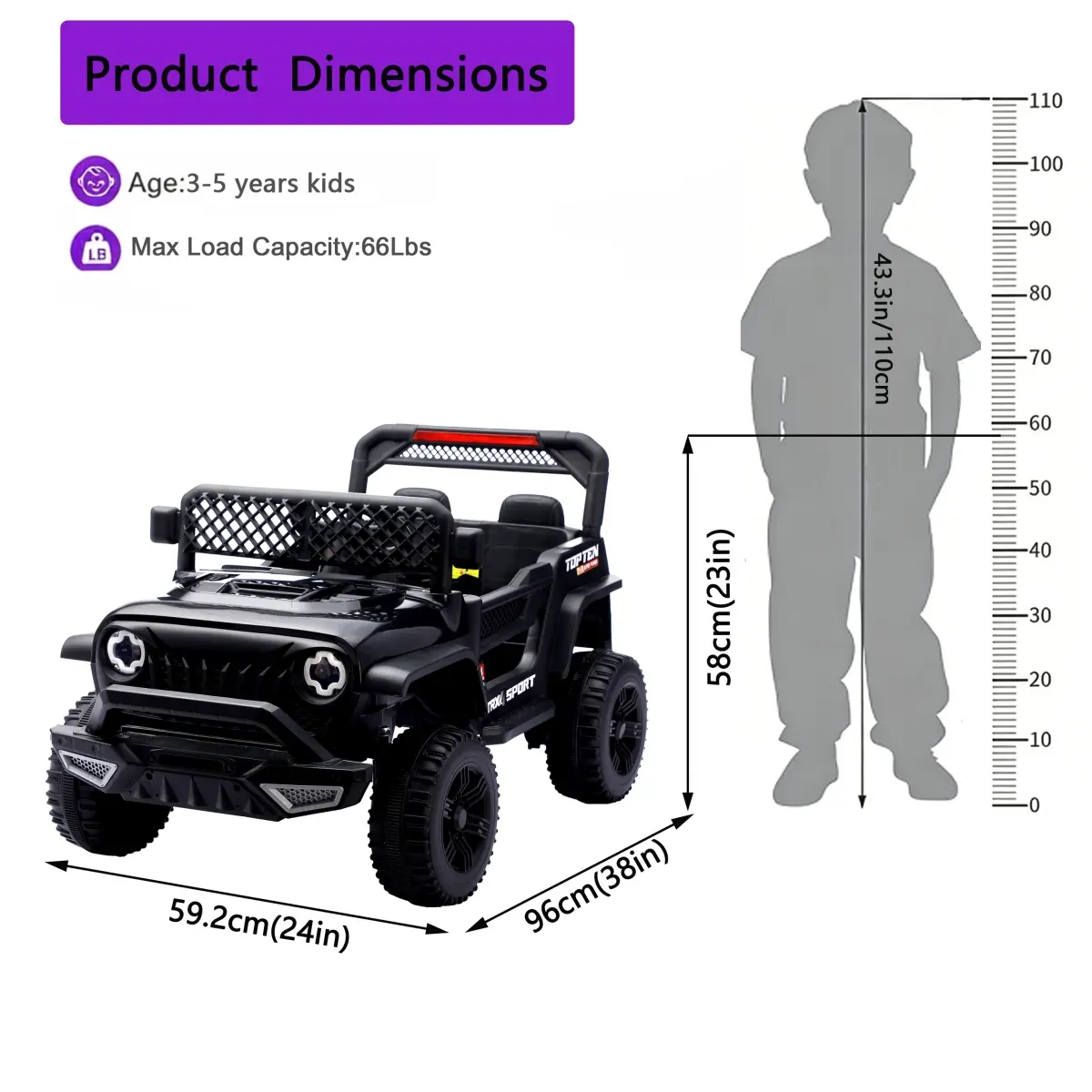 Ride On car Specifications Car Size:38*24*23(in) Package size:33*20*10(in) G.W:23/25(LB) Speed:1.8~3.2 MPH Load Capacity: 66 LB Battery: 12 V 4.5 Ah*1 Motor:12V380*2 MAIN FUNCTION: ● Multi-function music player ● One-click slow start ● power display ● LED light ● 2.4G one-to-one remote control ● double door can open ● wireless connections to mobile phones ● front and rear swing