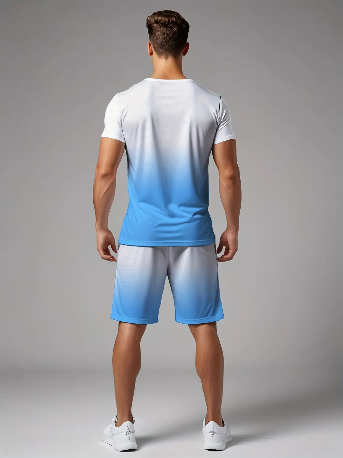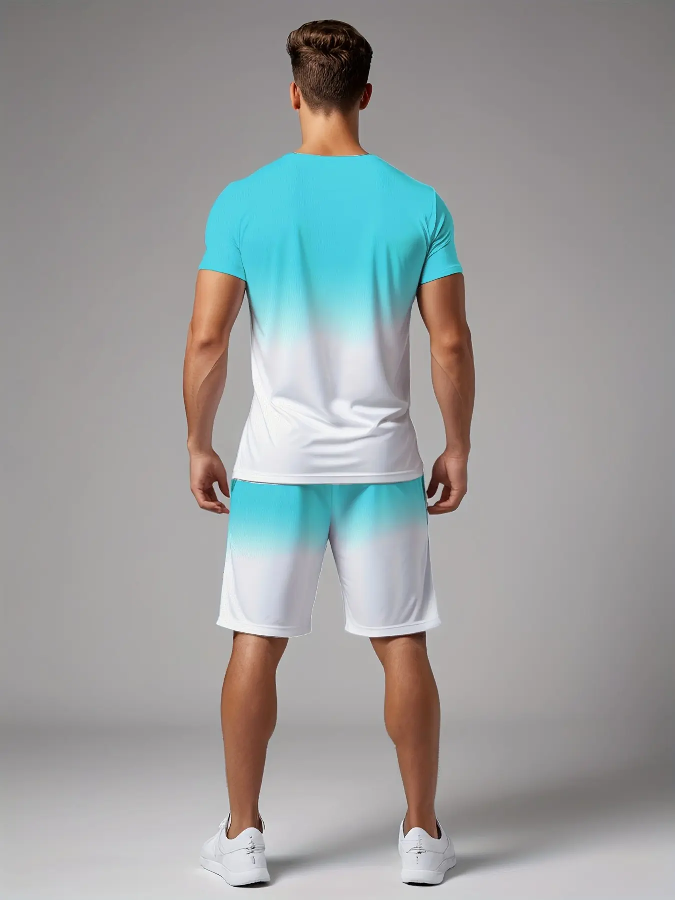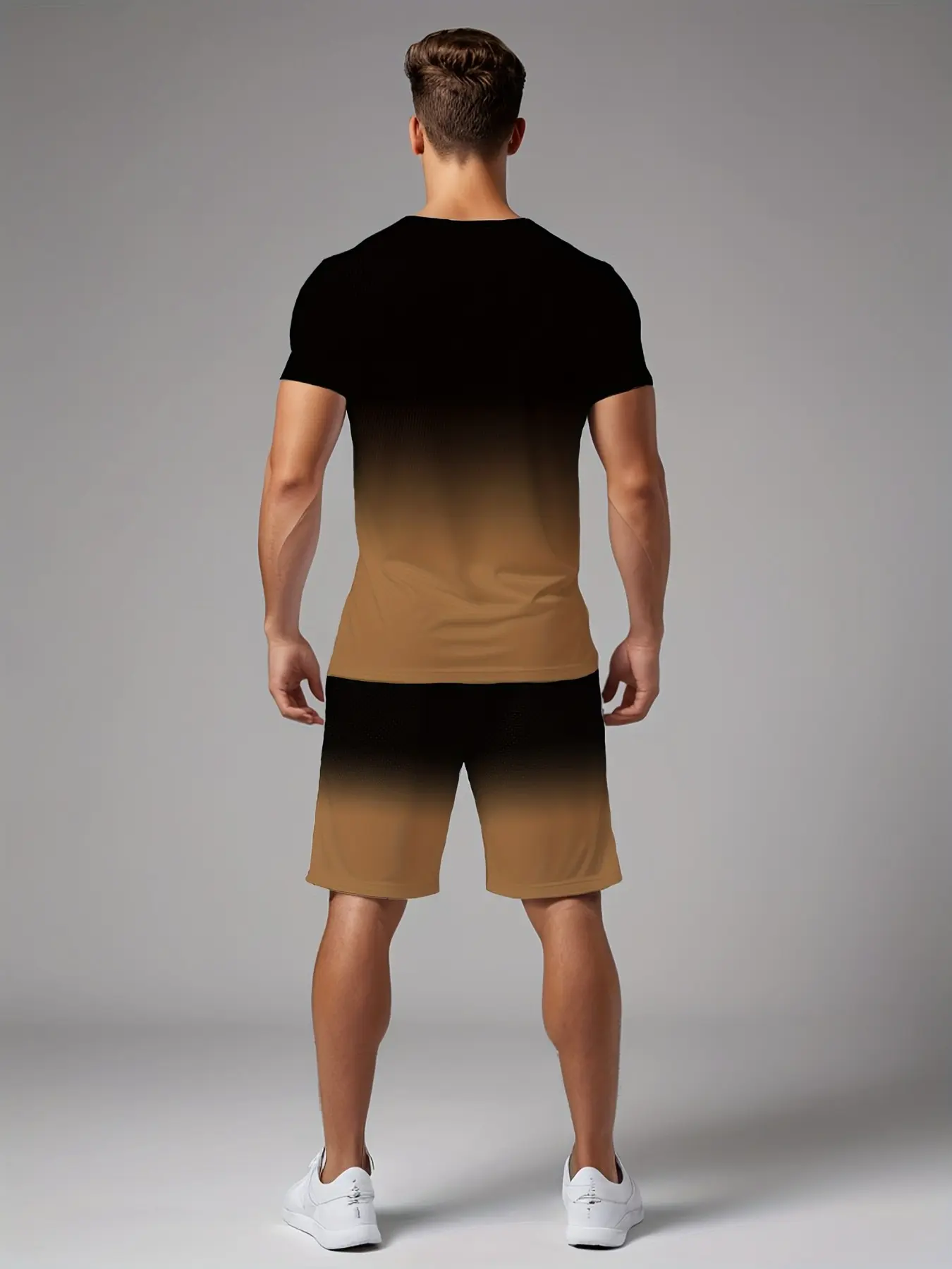 Men's Summer Gradient Patchwork Set, Cartoon Pattern Short Sleeve T-Shirt and Shorts, Breathable and Quick-Dry, Ideal for Outdoor Activities
