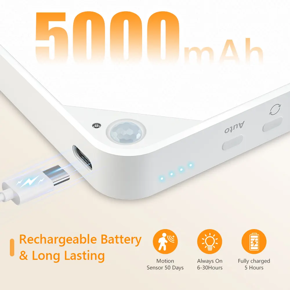 Powered by a high-capacity 5000mAh rechargeable battery, this light delivers exceptional runtime. In Motion Sensor mode, it lasts up to 50+ days per charge depending on brightness and usage. In Always-On mode, enjoy 6–30 hours of continuous light. Say goodbye to disposable batteries—save money and reduce waste.