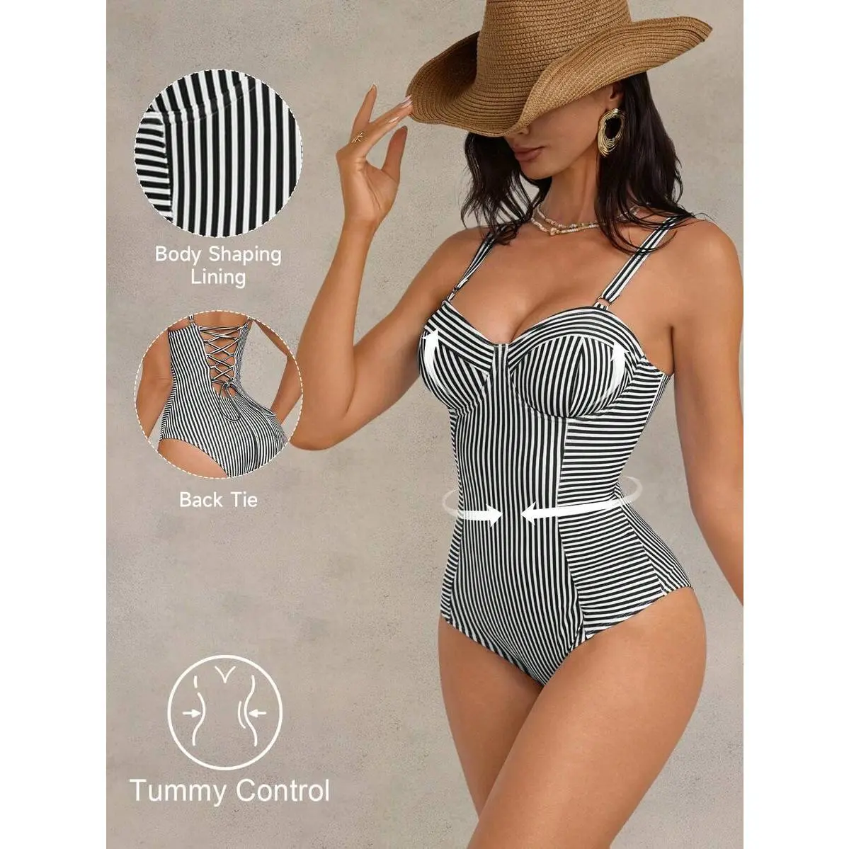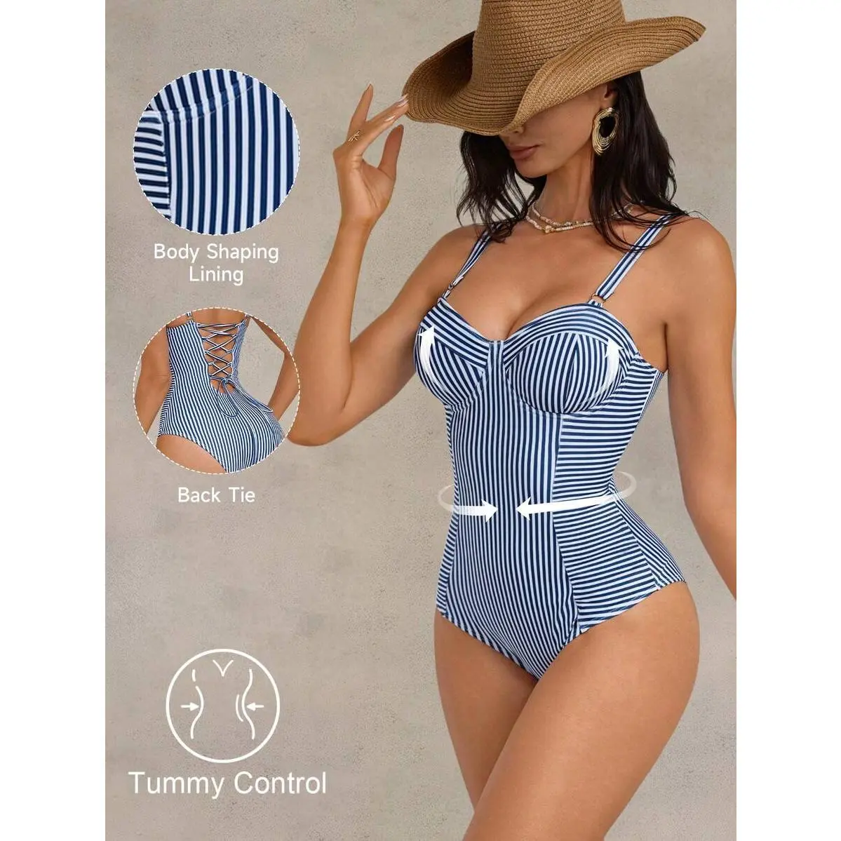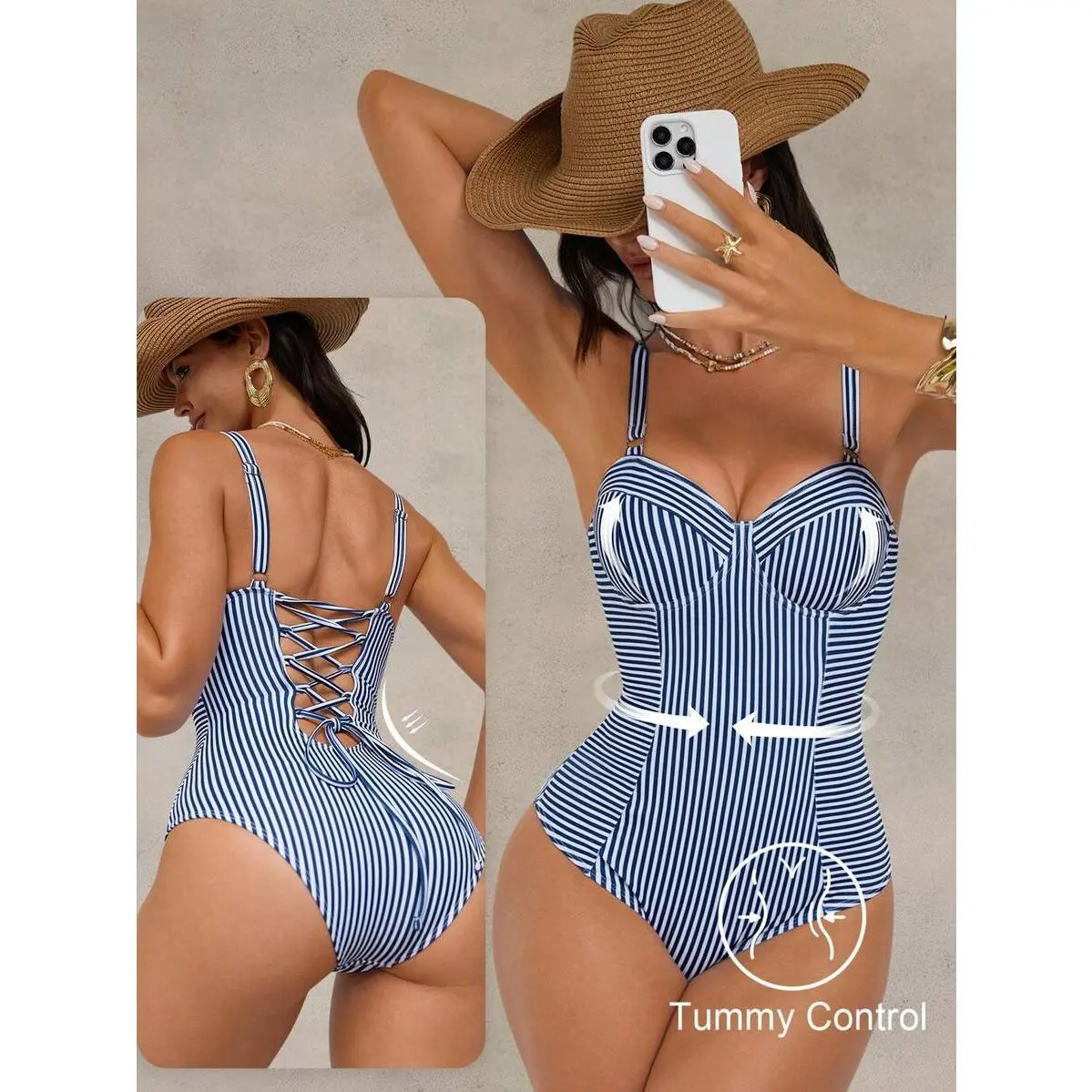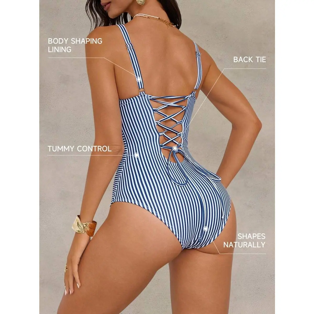 Shapewave Women's Blue & White Striped Patchwork Drawstring Backless Push-Up Tummy Control One-Piece Swimsuit, Slimming Waist, Suitable For Beach, Vacation, Party