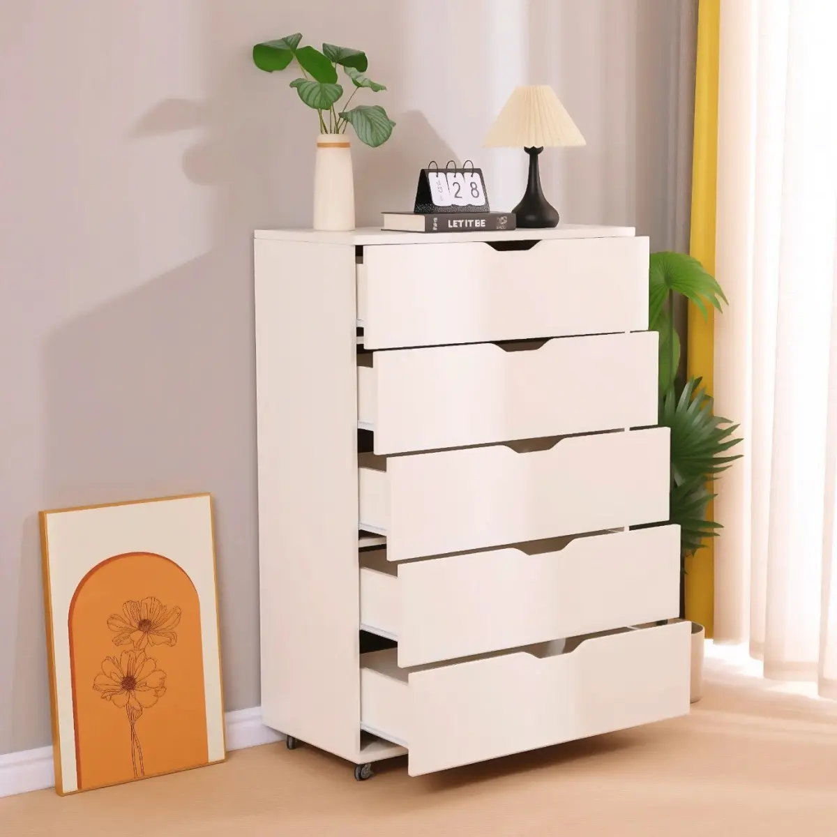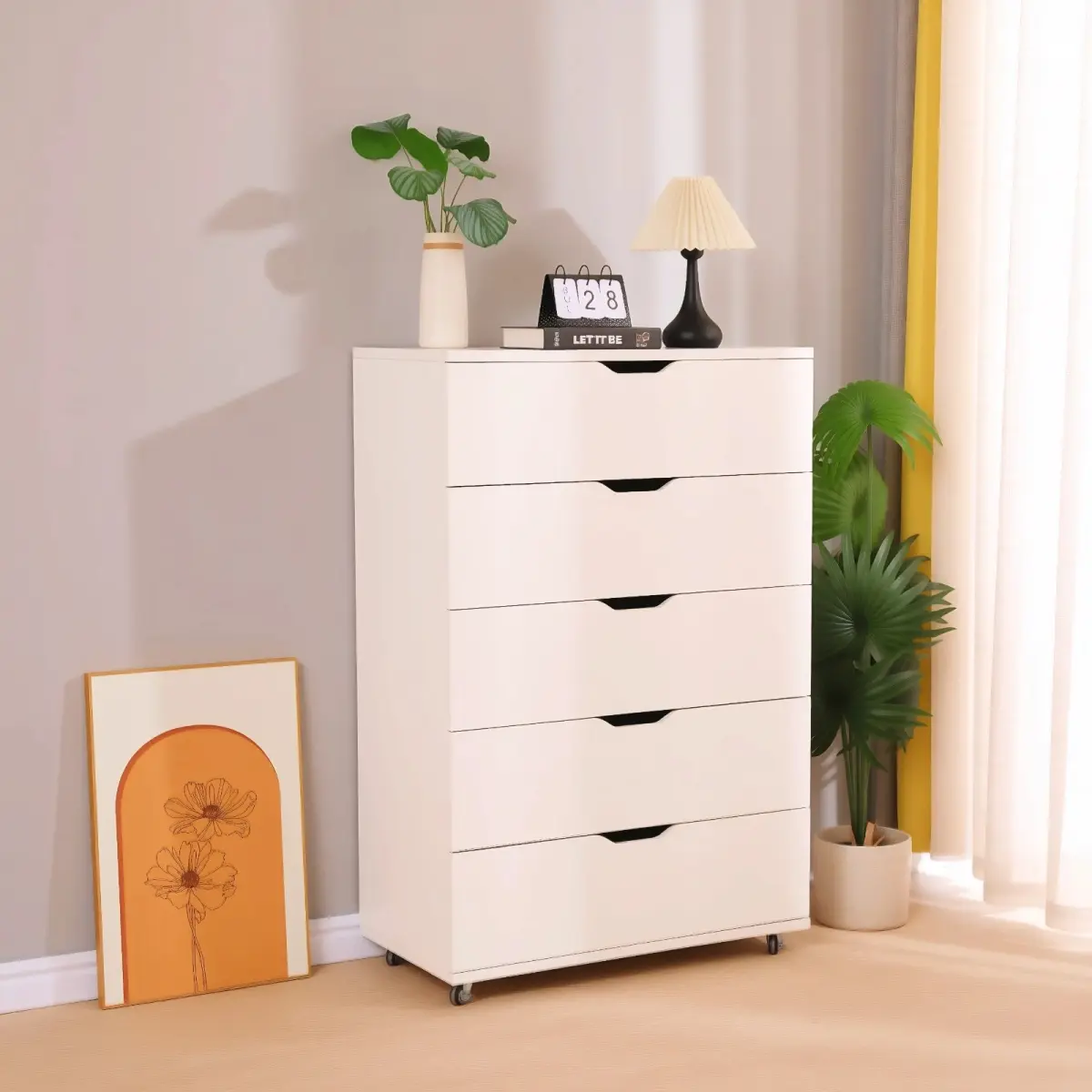 Organize your home in style with this 5-drawer dresser on wheels.Featuring five large drawers, it offers ample storage for clothes, towels, toys, books, linens, and more.The mobile design includes 360° swivel casters with 2 locking wheels, allowing smooth mobility and secure placement wherever you need it.Smart cut-out handles create a sleek, handle-less front that prevents bumps and provides comfortable grip access.Easy assembly with complete hardware and instructions included.Perfect for bedrooms, living rooms, nurseries, or home offices.Available in Gray, White, White+Cute (decorative option), Rustic Brown, and Dark Brown.