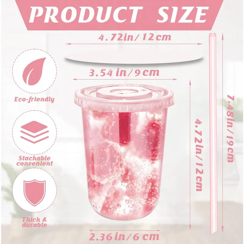 Package includes: You will receive 16 oz plastic wine glasses, 50 straws and 50 sheets of leak-proof paper, measuring approximately 3. 54x4. 65 inches, enough for your party, these disposable plastic wine glasses are safe to drink and for tasting cocktails, whiskeys and wines:These 16oz single-use plastic cups are made from high-quality PET plastic and. They are crystal clear, durable, impact and crack resistant, transparent material gives the cup a food and drink appearance, giving you a good use experience. Please note that you can pour liquids below 80 ℃ Wide Application:Our plastic cocktail glasses are ideal for serving all kinds of hot and cold drinks such as champagne, beer, wine, cocktails, juices, smoothies, milk tea, coffee, lemonade, iced tea, bubble tea, lemonade, smoothies, cakes, sodas, frozen drinks, mixed drinks and more! It is a must-have item for coffee shops, family gatherings, birthday parties, weddings, graduations, Christmas and other occasionsCompact and Lightweight:Our disposable cups are lightweight, stackable and won't take up a lot of your storage space. In addition, these disposable wine glasses do not need to be cleaned, as they can be discarded directly after use, saving you cleaning time and allowing you to fully enjoy your partyAnd you don't have to worry about the knocking over the glass. Please note that the goods will be slightly squeezed during transportation, which is a normal phenomenon and can be taken out only by rotatingApplication: Our coffee cups are suitable for holding a variety of hot and cold drinks, enough to meet your party use and change requirements, U-shaped cups are family gatherings, birthday parties, weddings, graduation ceremonies, Christmas and other occasions essential items