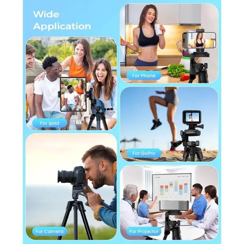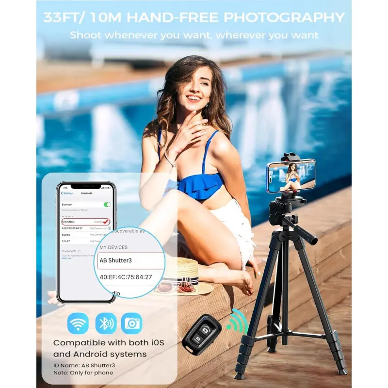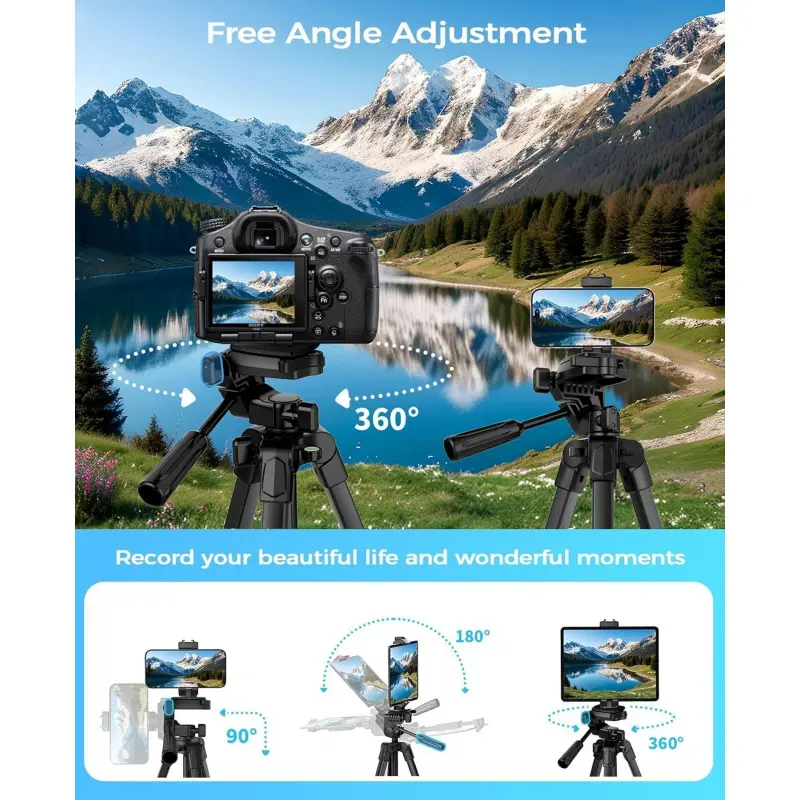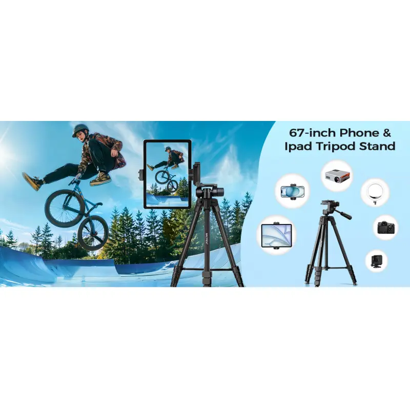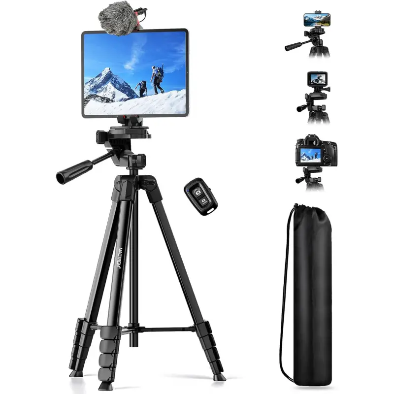[2-in-1 Phone and Tablet Holder]Our iPad iPhone tripod's spring-loaded, made of premium plastic and thick rubber pads for a secure grip. It can hold cell phones and tablets with widths ranging from 4 to 12. 9 inches, including popular models like iPhone 12/13/13 Pro/13 Pro Max/14/14 Pro/14 Pro Max, Galaxy series, iPad Air, all size iPad and more. With its adaptable design, it's compatible with various smartphones and tablets, making it a compact and sturdy choice for all your device-holding needs. This tripod for iPhone, iPad and lightweight cameras. [Superior Stability]Crafted from premium aluminum alloy with non-slip rubber leg pads, our ipad iPhone tripod stand provides solid support for all your photography needs. Compatible with smartphones, cameras, and tablets, it's the ultimate choice for photographers, vloggers, and family gatherings, ensuring your content creation and live streaming are top-notch. [Lightweight and Durable]Extendable from 17. 7 to 67 inches, our tripod for iPhone iPad stand is for various photography heights. Crafted from high-quality aluminum alloy, it's sturdy yet lightweight at just 1. 6 lbs, making it ideal for travel and outdoor use, providing stable and secure support even on the roughest of terrain. Plus, It features built-in bubble view levels for balance and a 360 ° rotatable 3-way pan head for capturing wide-angle shots. [Wireless Remote Shutter]Our iPhone tripod stand includes a compact Bluetooth remote ( CH-3 ) that lets you capture photos and videos from up to 33ft away, whether it's for group shots, selfies, or more. It's user-friendly and works seamlessly with both iOS and Android phones, eliminating the need for manual operation and app downloads. [After-Sales Service]Our travel tripod for iPhone iPad kit comes with a selfie tripod, remote ( CH-3 ), portable bag, and phone/tablet mount. Enjoy peace of mind with our 12-month warranty and responsive customer support. Reach out with any questions or concerns, and we're committed to promptly delivering satisfactory solutions for your peace of mind.Any problem free return service * 1 year, please feel free to contact us.