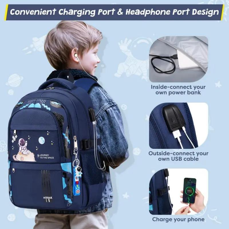 [USB & HEADSET PORT DESIGN]This boys backpacks has not only a USB port with built-in USB cable, but also a headphone interface.It's convenient to charge your phone or other devices anywhere and anytime while keeping your power bank inside of the bookbag.Listen music on the go with hands-free!It's ideal for walking, riding a bike, or commuting by train.