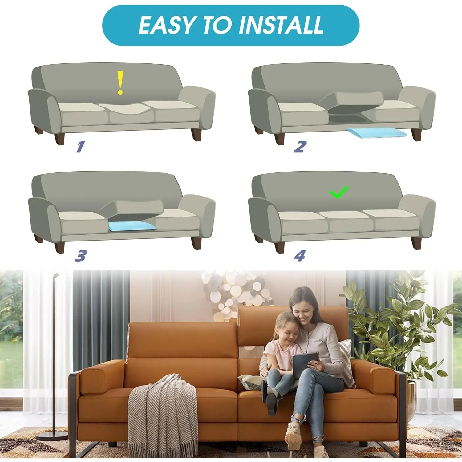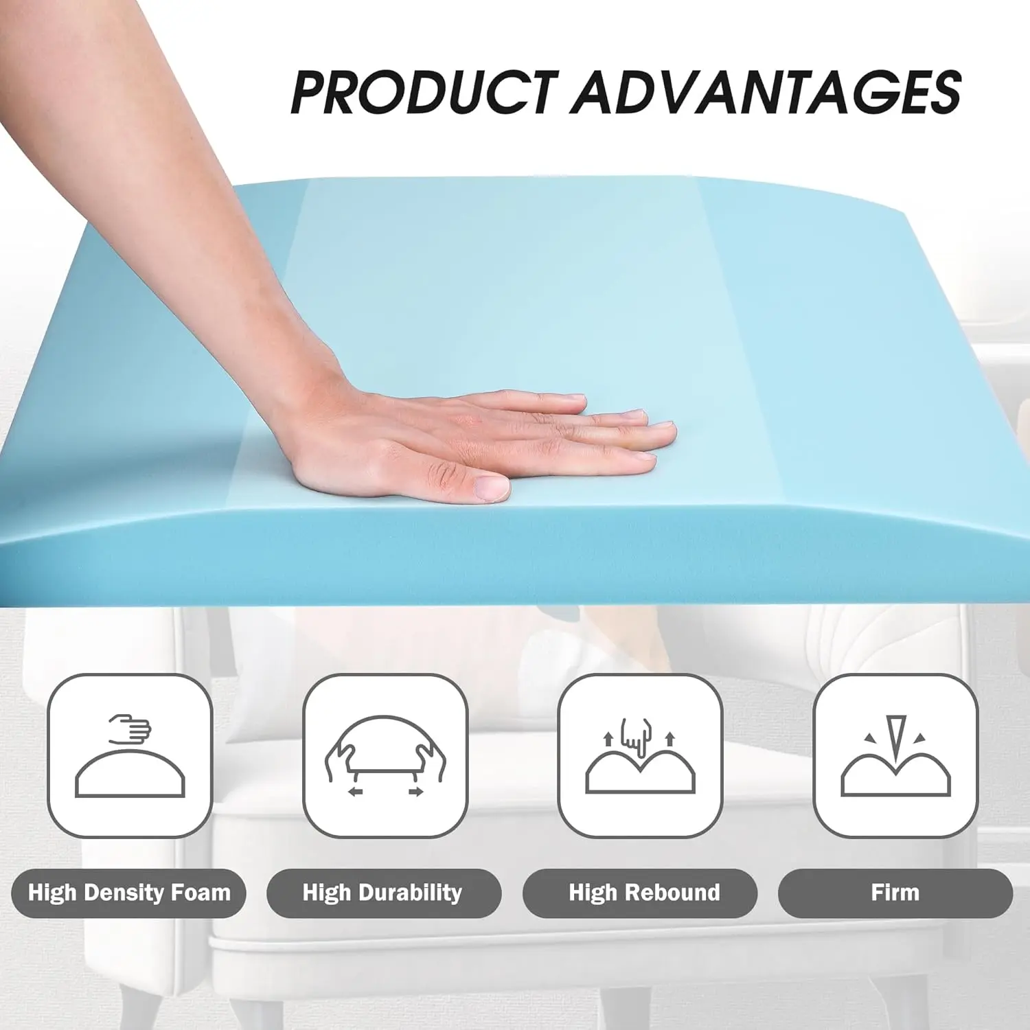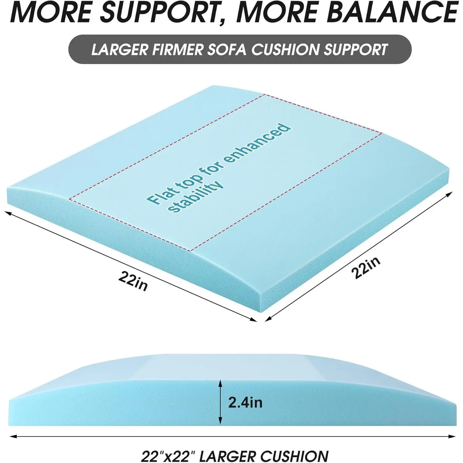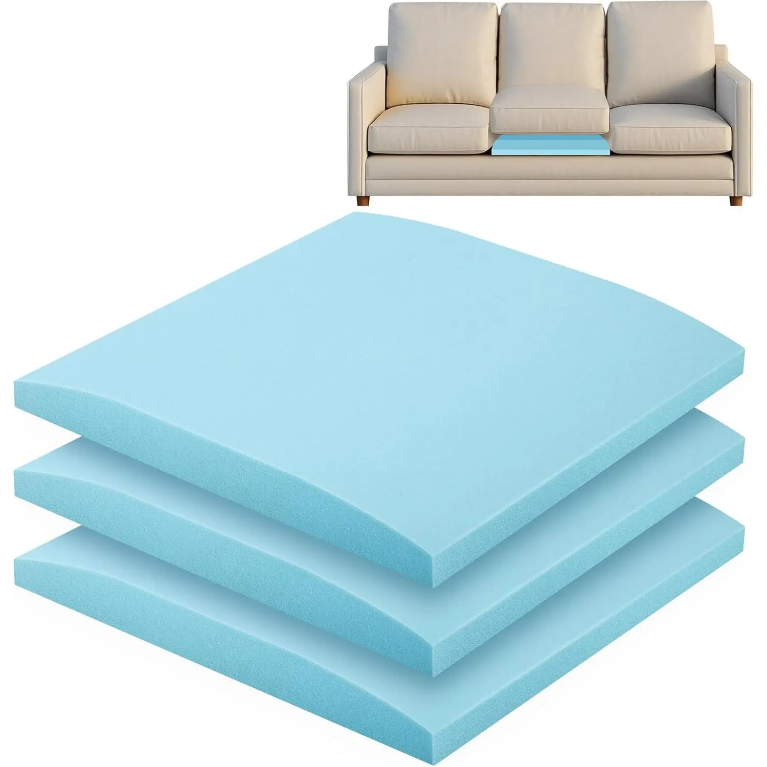 Upgraded size: The overall size of the cushion support is 22 * 22 inches with a thickness of 2.4'' in the flat top.The curved design provides better support and extends the service life of the sofa.You can enjoy a more comfortable and soft sofaHigh density foam: Couch cushion support are made of high-density foam with high rebound, high durability, which is not easy to deform for long time sitting.It improves the support of the sofa cushion and guarantees long-term useEasy to use: It is easy and quick to place our sofa cushion sagging repair without complex tools and step, and make your sofa a new look!Blue can be integrated into the living environment perfectly.Just enjoy a soft couchWidely use: Our curved high density foam replacement is ideal for holding up and restoring sagging chairs, loveseats, sofas, recliners, RV cushion and pieces that have removable seat cushionsWarm tips: This sofa cushion sagging repair is vacuum packaging, and you may need to wait a while for it to restore the original shape.If you have any other questions or order problem, please contact us