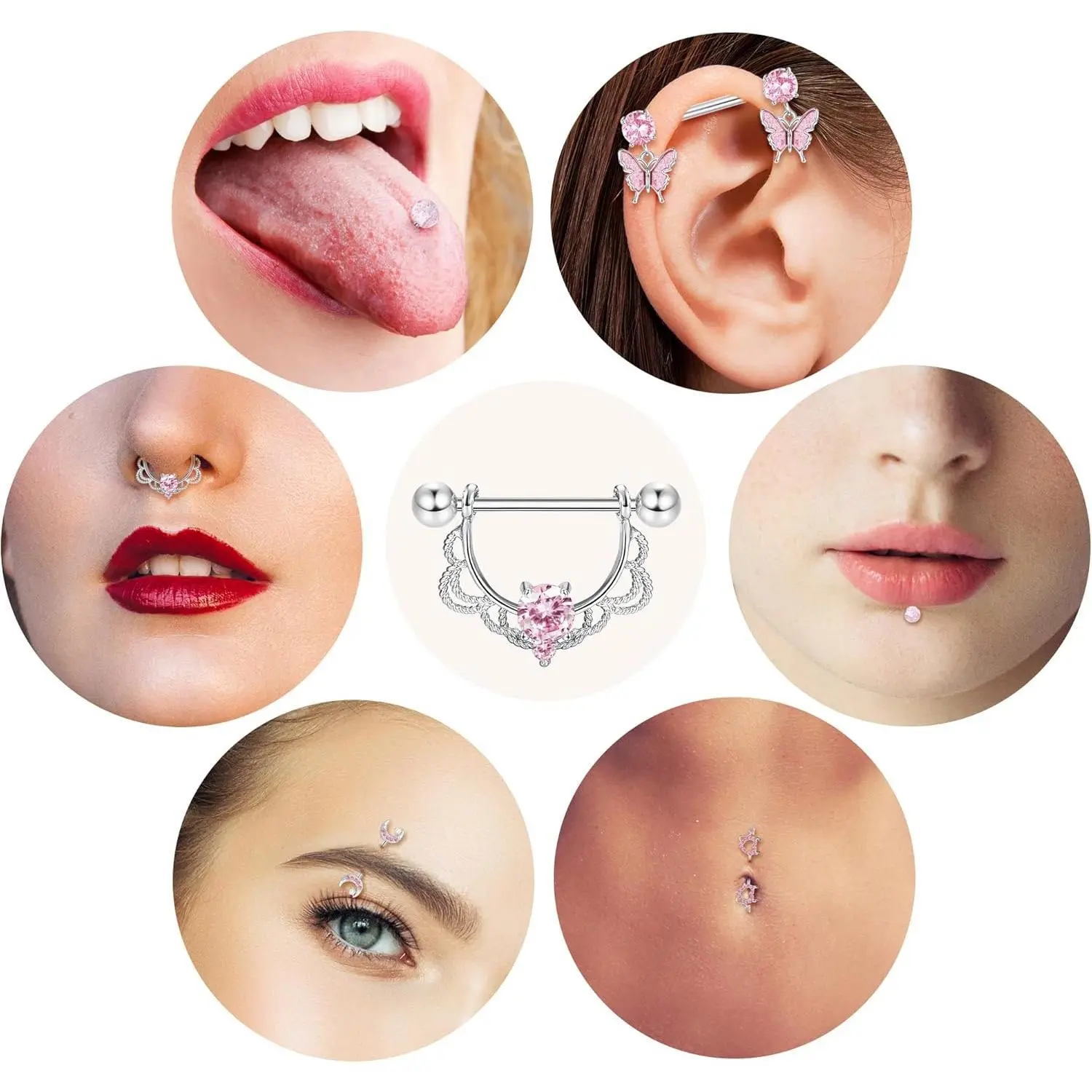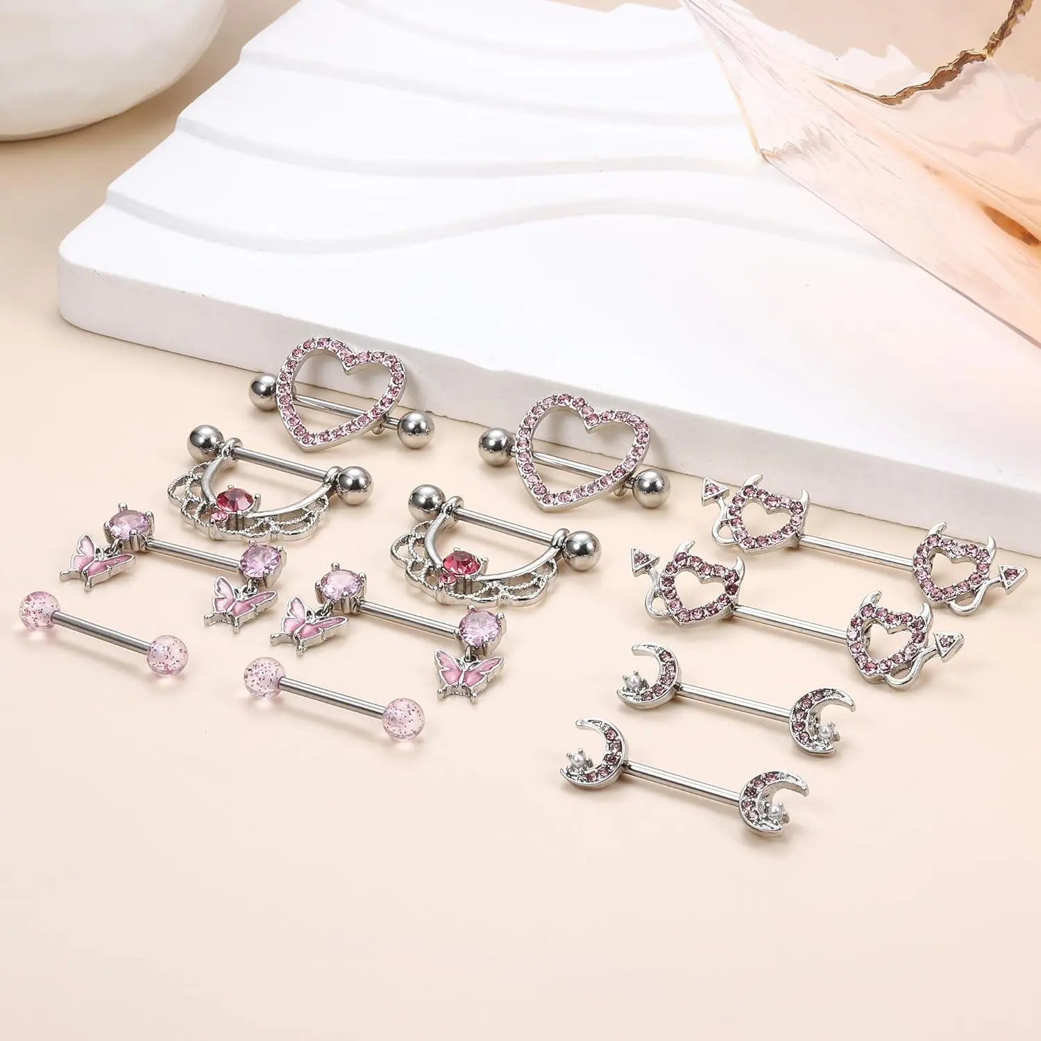 ·Pink Heart Nipple Bar: 6 pairs of nipple bar nipple rings a set, 5 different styles and colors for you to choose from. Simple classic heart CZ barbell nipple piercing and fashioable butterfly dangle nipples, little devil and moon shape nipple piercing; delicate and elegant in appearance, make you more charming and attractive