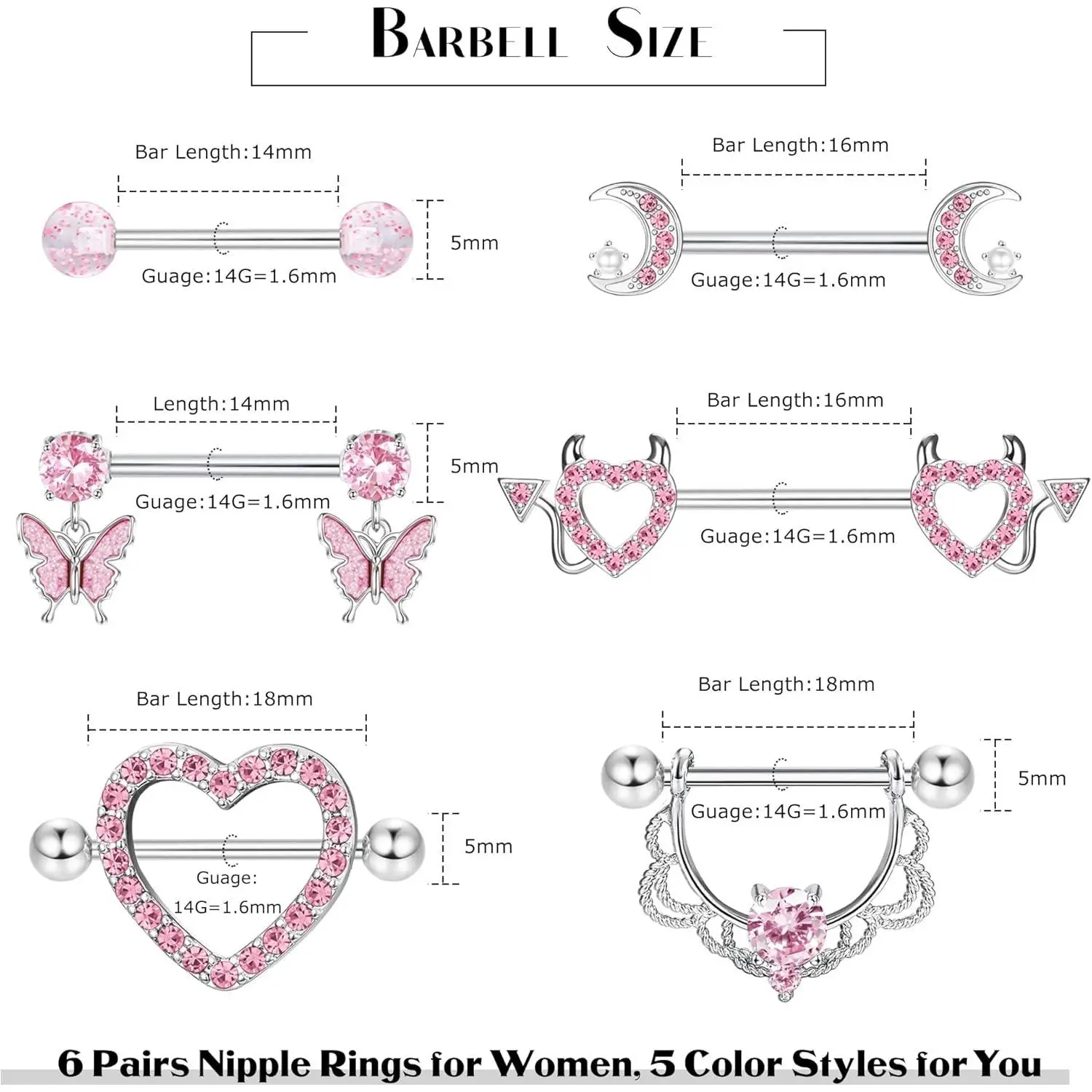 ·Avaliable Size: Barbell Nipple Rings Gauge: 14G(1.6mm), Bar Length: 14-16mm, Heart CZ Shaped Nipple Rings Bar Length: 18mm; suitable size fits most women, easy to wear and take off