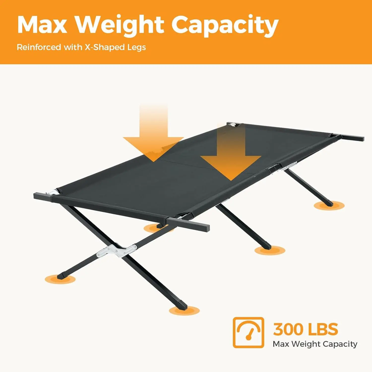 Built to last. The X-shaped metal leg frames and reinforced 400D Oxford cloth provide rock-solid support for adults of all sizes. No sagging, no bending, no worrying. Rated for 300 lbs, this army cot is as tough as you need it to be.