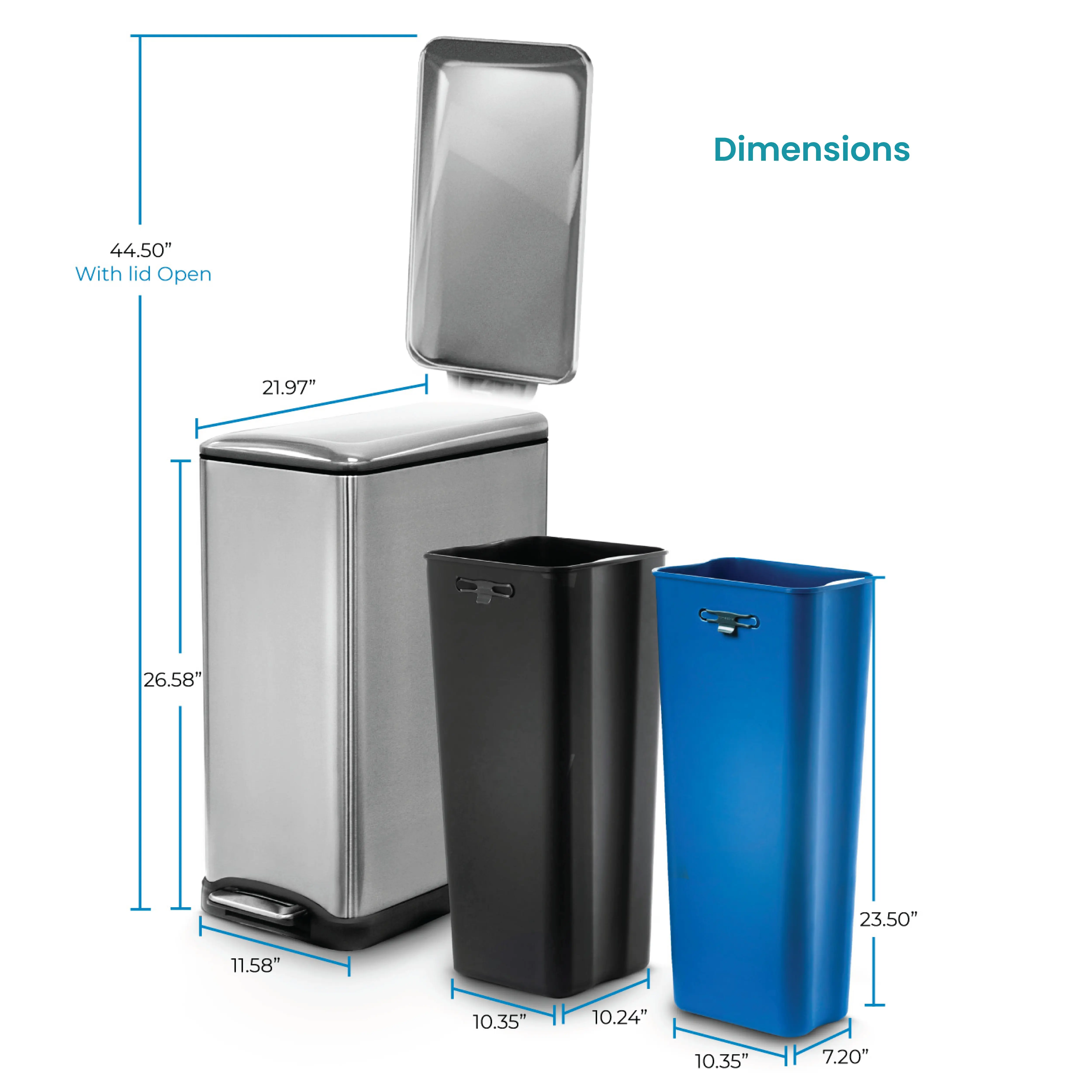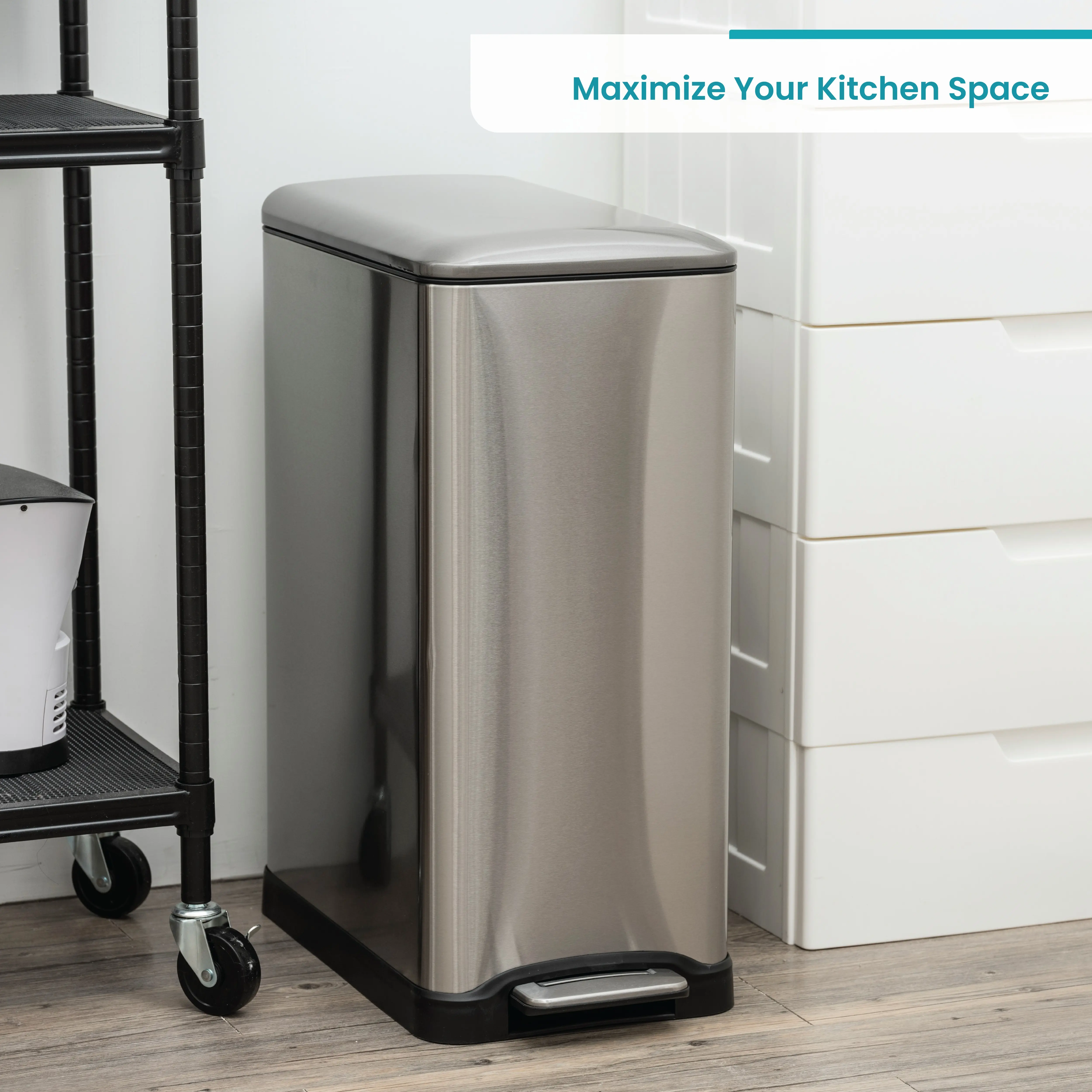 From Home Zone Living, this 13-gallon trash can makes everyday sorting easy. Two separate compartments keep trash and recycling organized in one sleek design. The stainless steel exterior resists fingerprints for a clean look, while the soft-close lid shuts quietly to reduce noise. A sturdy step pedal lets you dispose of waste hands-free, and removable buckets make bag changes quick and tidy. Perfect for kitchens or shared living spaces that need a smart, space-saving waste solution.