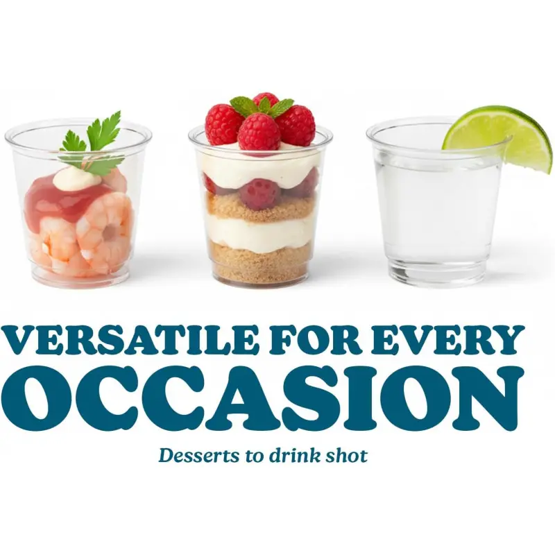CLEAR 2OZ SIZE: These 2oz Clear PET Cups provide the capacity for serving shots at any party or event, ensuring your guests enjoy their beverages in style.BPA-FREE: Crafted from high-quality PET plastic material, these shot cups are BPA-free and safe for all your drinking needs, giving you peace of mind while you enjoy your favorite beverages.CLASSY & CASUAL DESIGN: With a sleek, transparent design, these cups perfectly blend elegance and casual vibes, making them suitable for various occasions, from upscale gatherings to laid-back parties.IDEAL FOR PARTIES & EVENTS: Be it a birthday bash, cocktail party, or any other celebration, these versatile, easy-to-clean PET cups are a must-have for providing a hassle-free and enjoyable drinking experience.