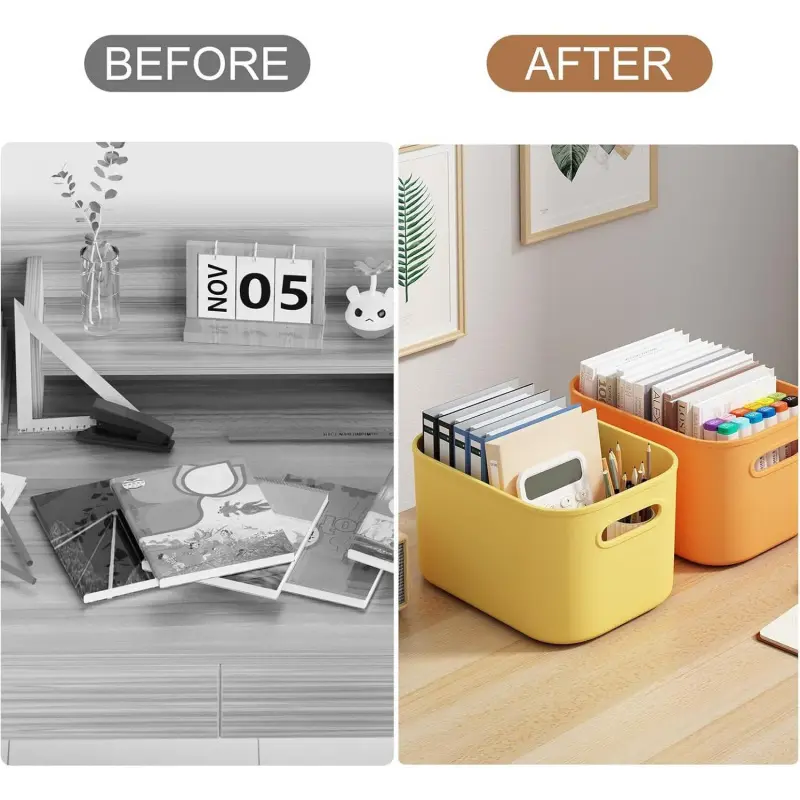 VERSATILE- The colored plastic storage container with handles keep everything nicely separated and organized within your bathroom, kitchen, pantry, laundry, closet, playroom, stackable storage bins are right for craft supplies, art supplies, towels, makeup up, office supplies, snacks, pens, use them for all sorts of things and help you keep organized. HANDY &STACKABLE-Size:9. 85"(L)x6. 9"(W)x5. 7"(H), ORGIDOL storage container for organizing are stackable and nestable,help maximize storage space, it's easy to grab when you want to store and play with them, to de-clutter your laundry room and hide stuff away, these colored bins are very versatile, and can be used to organize things in all areas of a home. REDUCE CLUTTER-Easy to label, this storage container for shelves are slim and tall which makes them convenient for the smaller space on your shelves, these storage bins are for organizing pantry, shelves, cabinet in kitchen, laundry room, bathroom, closet, classroom, a desk, keep everything clean and sort together. BUILT IN HANDLE & LID-The colorful storage bins with lids built in handles for easily take out and slide back from the shelves, just pull it out with the hole as handle and take out what you need and slide back, make it easier to grab without possibly tipping things over, removeable lid can be opened and put back easily,keep the contents of the box dry, clean and away from dust and cats. DURABLE & ENJOYABLE-Our colorful plastic bins for shelves made of sturdy, slightly flexible plastic that it won't break easily, the corners are rounded-no corners to hurt little ones, wash them with soap and water, the storage containers for classroom are just right for containing various laundry products, bags of loose leaf teas, nail supplies, sewing supplies, bathroom essentials, whatever you need them for, if you have any problems, pls feel feel to contact us.