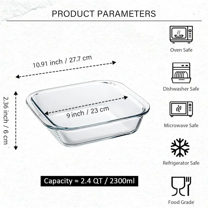 Versatile 9x9 Baking Pan : The 2. 4QT Square Glass Baking Dish is for a variety of baking needs, from casseroles to brownies, making it an essential addition to your kitchen. High-Quality Glass Construction: Crafted from durable tempered glass, this 9x9 glass baking dish offers excellent heat distribution and is resistant to thermal shock, ensuring that your dishes cook evenly every time. Easy to Clean: This square baking dish is not only functional but also easy to clean. Simply place it in the dishwasher or wash it by hand for hassle-free maintenance, allowing you more time to enjoy your delicious creations. Oven Safe Up to 482 ° F: Our glass baking dish can withstand temperatures between 482 ° F and -4 ° F. Designed for use in the oven, accommodating high temperatures, so you can confidently bake your favorite recipes without worrying about damage.Stylish Design: The simple elegant design of this square baking pan enhances any dining experience. Serve directly from the oven to the table in style with this beautiful glass baking dish that complements your kitchen decor.