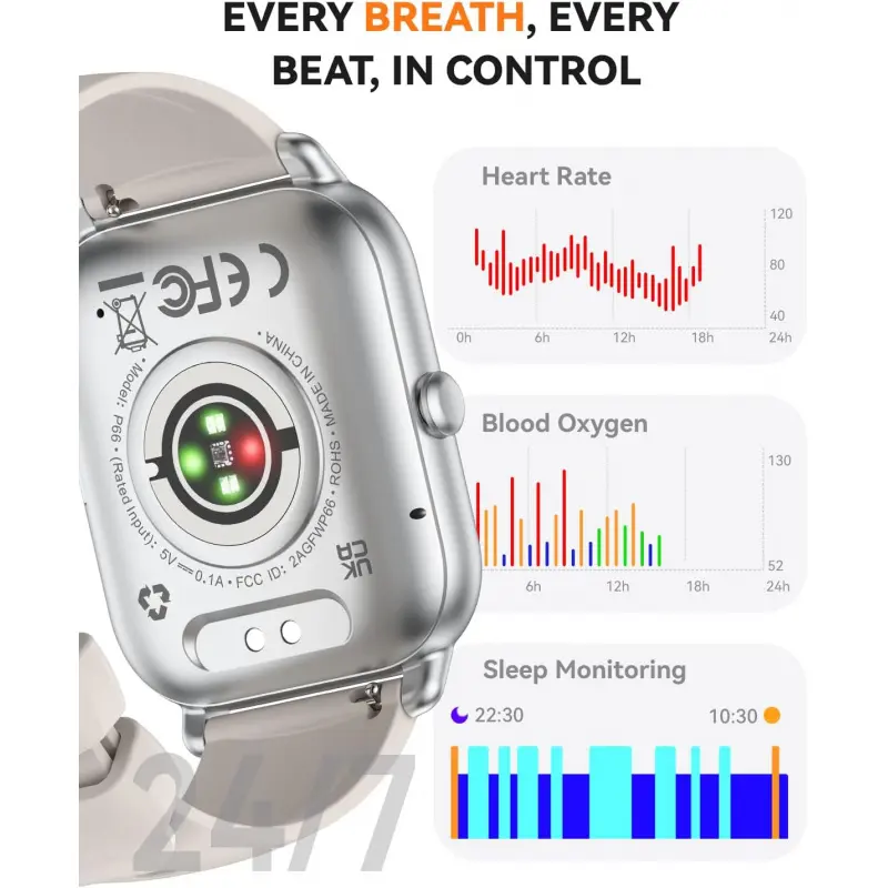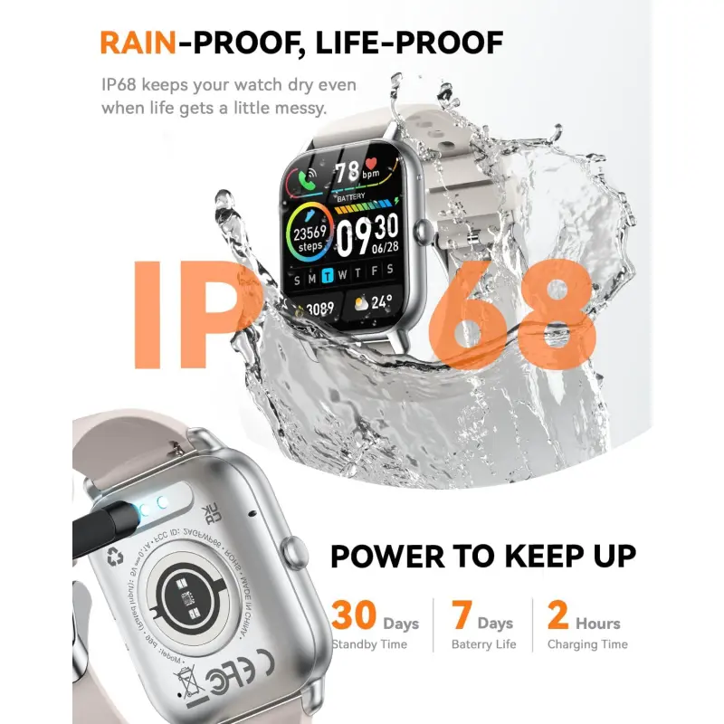 IP68 Water Resistance and Reliable Battery:** This watch is built for those who lead active lives, proudly showcasing an IP68 waterproof rating that protects against splashes, sweat, and brief submersion-making it ideal for workouts, outdoor pursuits, or drizzly days.Its robust 300mAh battery ensures 5-7 days of active performance and up to 30 days on standby, lessening interruptions.It is well-suited for all-day wear, from gym sessions to outdoor activities and daily travels.