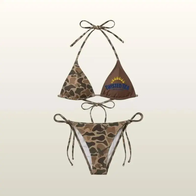 Twisted Tea Camo Matching Couples Swimwear Set – String Bikini & Men’s Camouflage Swim Shorts for Beach Party Vibes
