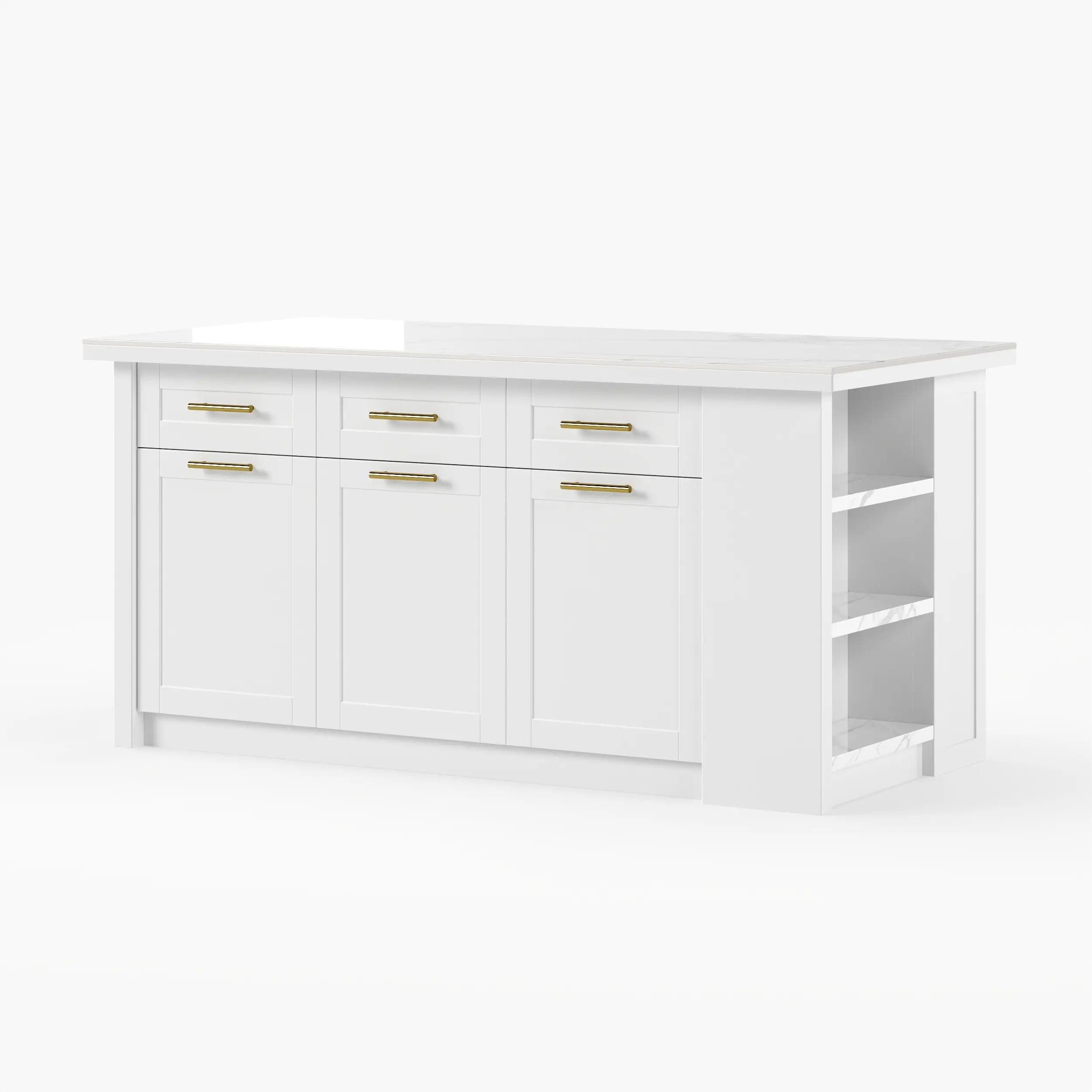 This 70.9" Modern Kitchen Island features a sleek white sintered stone top, great for any modern kitchen. There's plenty of storage included: 3 drawers, 3 doors, and 5 shelves keep your essentials organized. From a workstation to a prep area and even dining space, this multifunctional island effortlessly marries style and function. Constructed from durable stainless steel and MDF, this island boasts a modern design that elevates any kitchen or dining room environment.