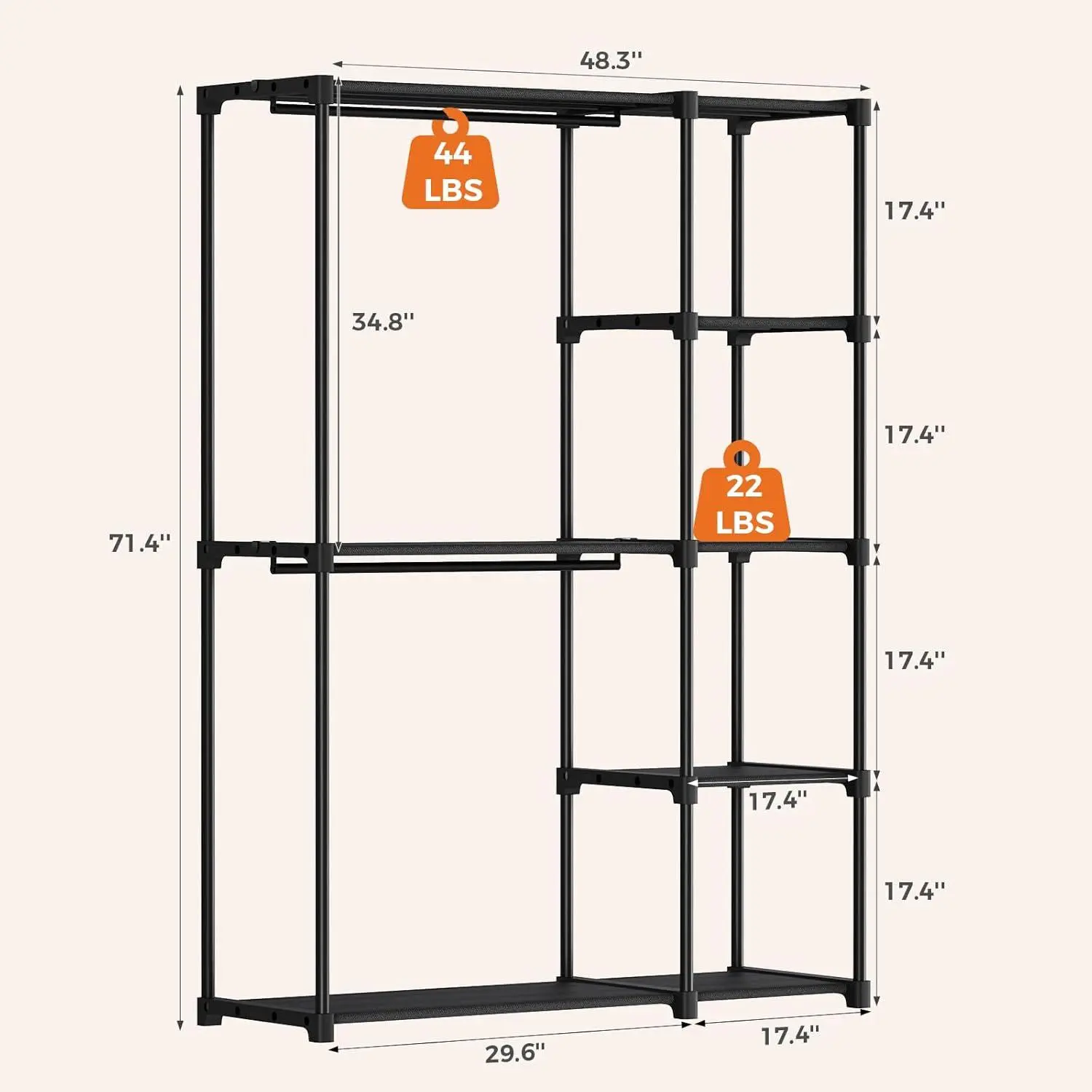 Built with thickened metal pipes and premium PP connectors, this wardrobe ensures long-lasting stability. The iron frame keeps the rack steady, even when fully loaded. No wobbling or tipping, just reliable daily use. The hanging rod supports up to 44 lbs, and each shelf holds up to 22 lbs.