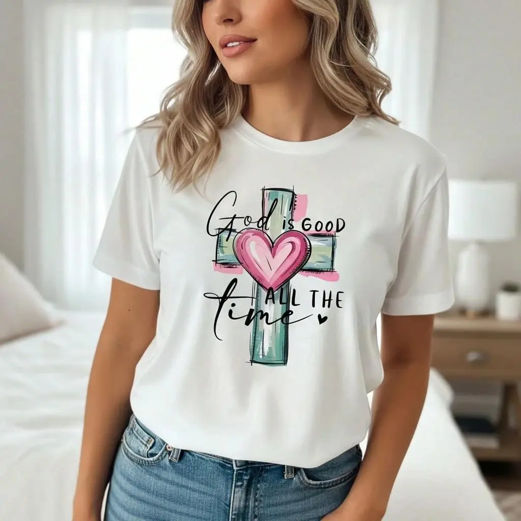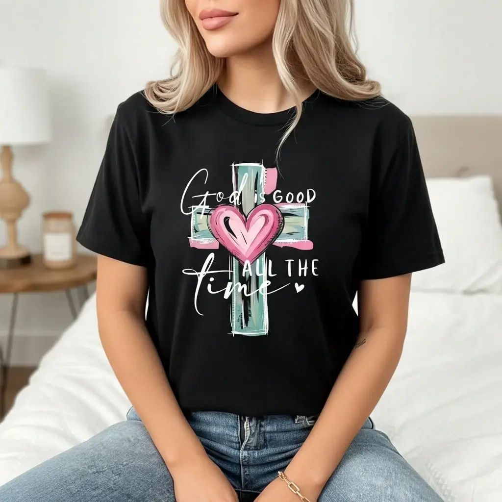 Women's Cotton Christian Graphic T-Shirt, "God Is Good All The Time" Cross & Heart Print Short Sleeve Tee, Casual Loose Fit Top, S-5XL Sizes, Black Basic Crewneck Tshirt For Daily Wear, Religious Faith Inspired Apparel