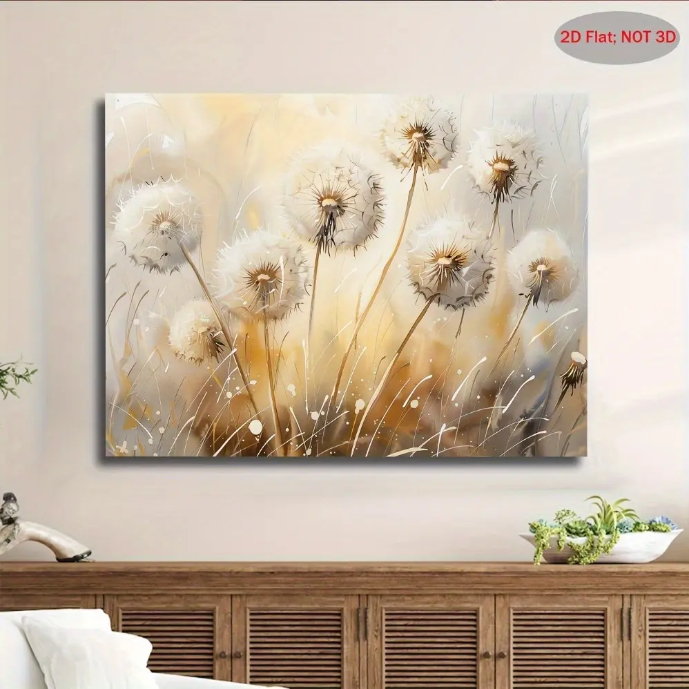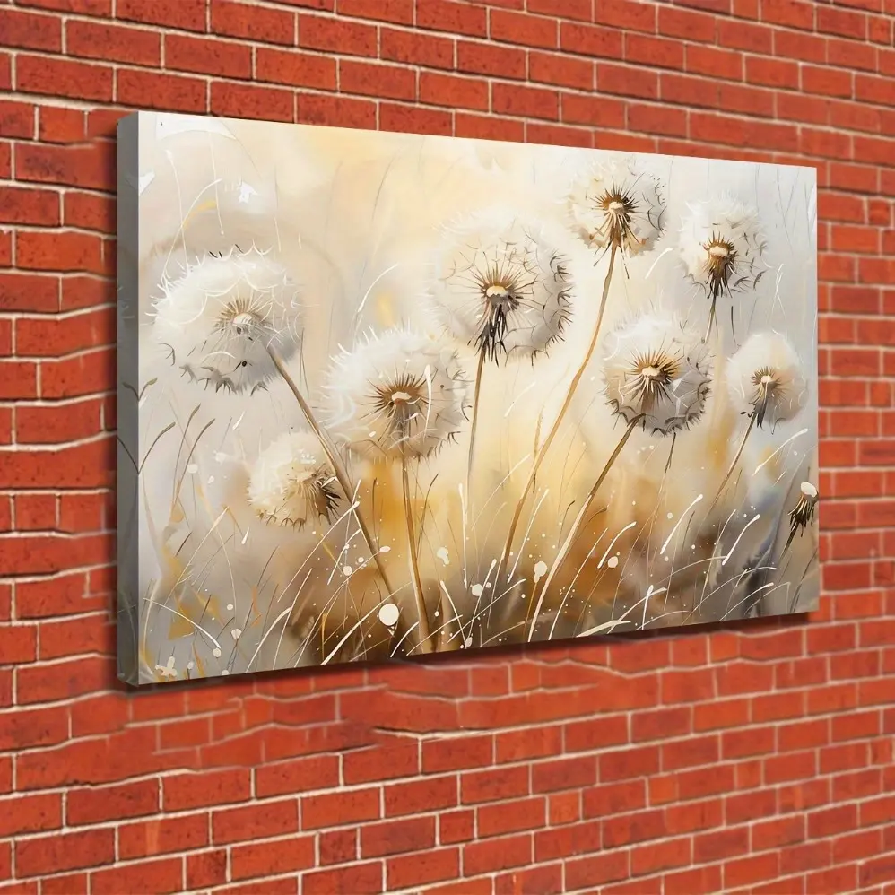 JIT 1PC ,Vintage-Inspired Dandelion Flowers Canvas Wall Art - Soft Beige  Golden Tones, Large  Framed Floral Painting, Ready to Hang for Bedroom, Living Room, Kitchen, Bathroom Decor - Perfect Holiday  Family Gift, Living Room Art