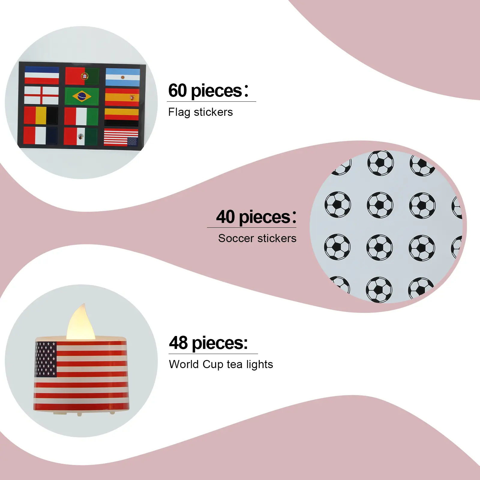Inside the box, you'll find 48 battery-powered tea lights, 60 country flag stickers, and 40 soccer ball stickers – everything you need to create custom candles that show off your team spirit. No fire, no mess, just peel, stick, and glow.