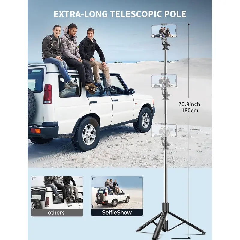 ✅[Versatile 71'' Phone Tripod]: SelfieShow's updated tripod combines the function of phone stand with a selfie stick.Effortlessly extends, A precision-crafted extension rod extends smoothly and uniformly, With a simple "Pull" the tripod iphone stand can be transformed into a long selfie stick, It glides to 70.86 inches tall tripod in less than a second.for taking selfies, Photographers, Youtube, vlogging, live streaming and Family Gathering.
