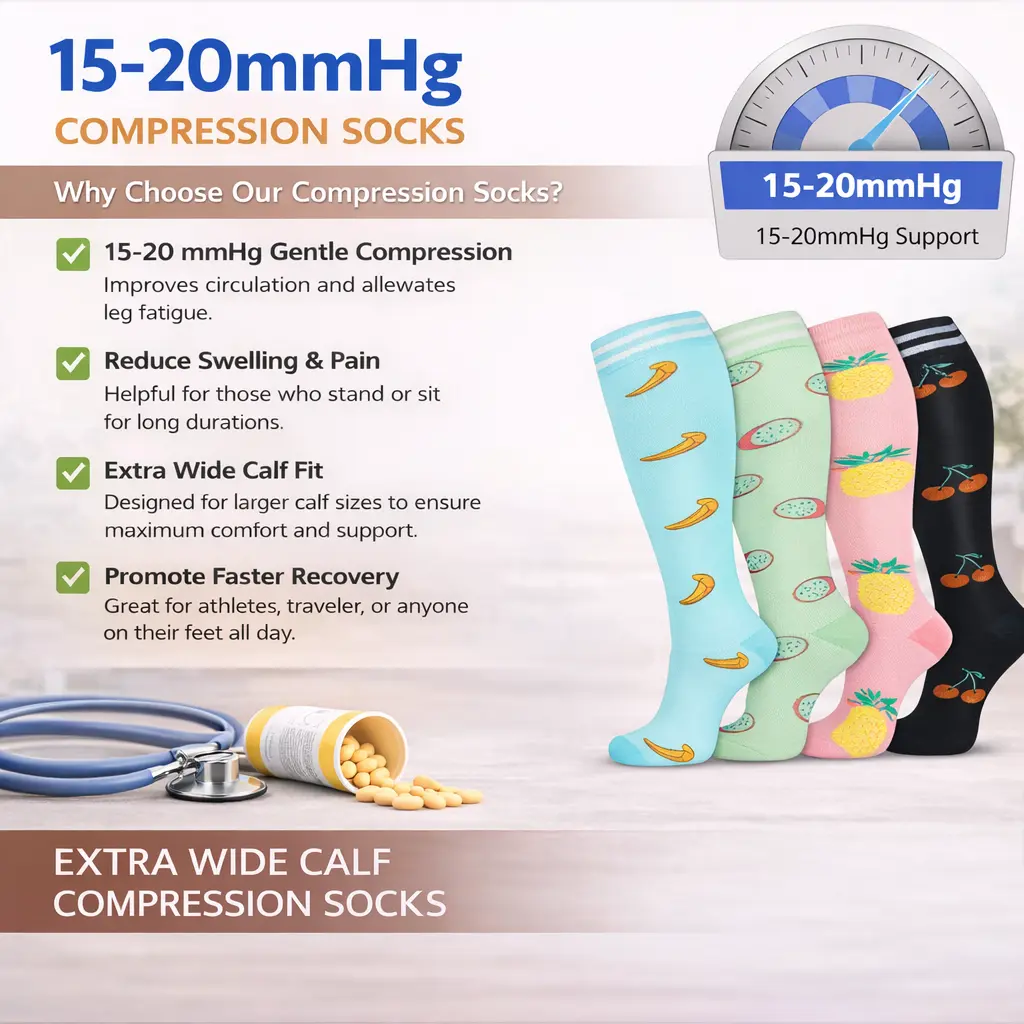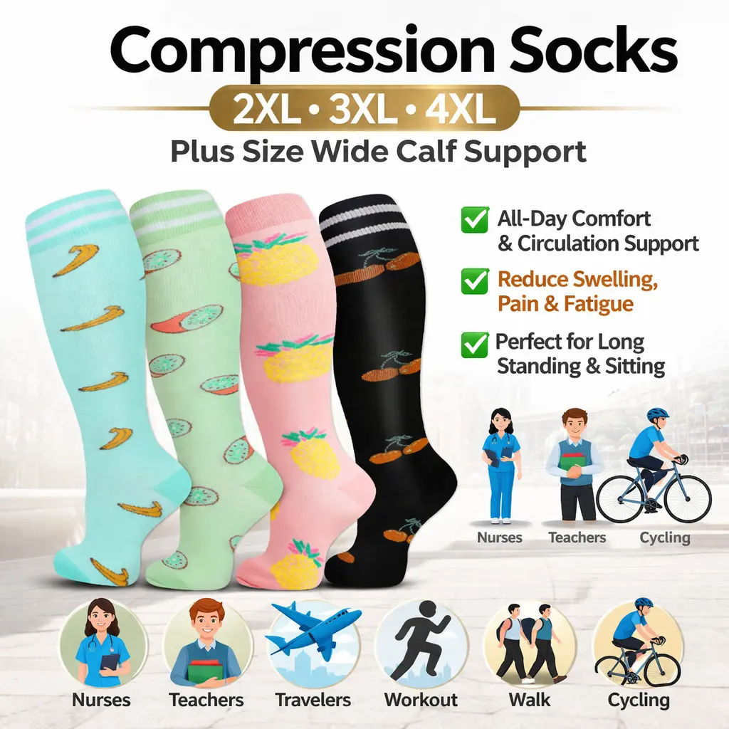 STANDWAY 4 Pairs Plus Size Compression Socks for Men & Women - Extra Wide Calf Design, 15-20mmHg, Below-the-Knee Socks, Breathable and Non-sticky, Promotes Circulation and Reduces Leg Pressure, Ideal for Nurses, Flying, Travel, and Running.