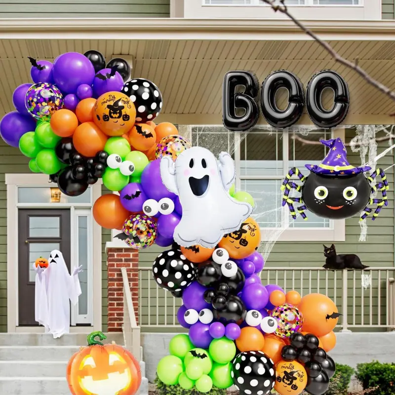 Transform your home, yard, or event space with this Halloween balloon arch kit featuring 144pcs balloons in classic festive colors like black, orange, dark purple, and green.Designed with eye-catching pumpkin, ghost, spider, and BOO foil balloons, this set instantly elevates your Halloween party decorations with a playful yet spooky vibe