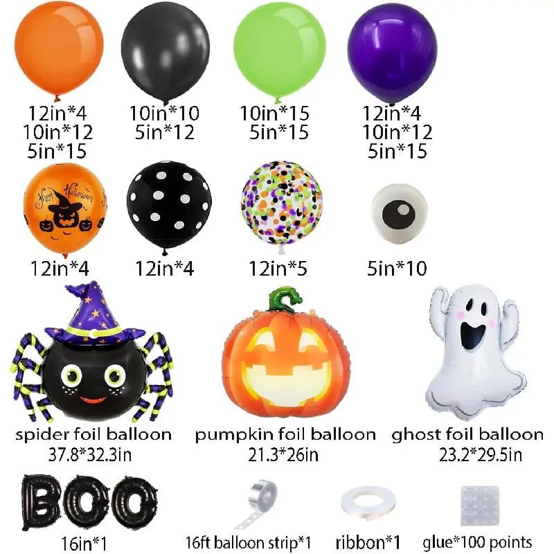 Complete Halloween Balloon Arch Kit: The 144pcs halloween balloon arch kit included 12’’balloons(dark purple*4, orange*4, orange printed*4, white dots printed*4, confetti*5), 10in’’balloons(black*10, orange*12, dark purple*12, green*15), 5in’’balloons(black*12, orange*15, green*15, dark purple*15, eye*10),pumpkin/ghost/spider/BOO foil balloons*1,16 ft balloon strip*1, 20pcs dots glue*5, ribbon*1. Note: The uninflated dark purple balloon looks the same as black, but when inflated it turns dark purpleEasy to Assemble Halloween Balloon Garland: Create a stunning Halloween balloon garland with the 16 ft balloon strip, 100pcs glue dots, and ribbon, making your party setup fast and funSpooky Variety of Sizes and Colors: The Halloween balloons come in 12 in, 10 in, and 5 in sizes with printed patterns and eyes, adding dimension and a festive touch to your Halloween decorations balloons displayPremium Material: All Halloween balloons decorations are made from thick latex and high quality foil, ensuring long-lasting shapes and colors throughout your ghost balloon arch or pumpkin balloon arch setupfor Halloween Party Decorations: Ideal for haunted house parties, trick-or-treat events, school celebrations, and photo backdrops, this Halloween balloons arch will make your celebration memorable and picture-ready