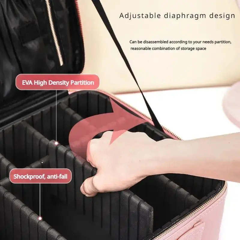 PLENTY OF STORAGE SPACE: This Makeup Bag have enough space to storage your makeup and cosmetic accessories, like lipstick, lip gloss, makeup brushes, eyeshadow, makeup palettes, hairbrushes, skin care products, nail polish, nail art tools, shampoo and so no.ADJUSTABLE COMPARTMENTS: This Makeup Bag have several compartments and makeup brushes slots, you can keep your makeup tools is neat and tidy. Special design adjustable compartments, you can adjust as needed.PERFECT TRAVEL MAKEUP CASE: Portable and Lightweight design, with waterproof, shockproof, anti-wear and spill-proof interiors. You can bring your cosmetics to anywhere.MULTIFUNCTIONAL MAKEUP BAG: This Makeup Bag not only can storage your cosmetic essentials, but also Jewelry, Electronic Accessories, Camera, Essential oil, Toiletries, Shaving Kit, Valuable objects and so on.