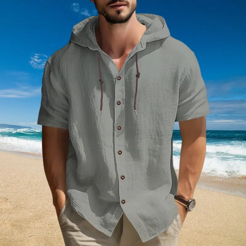 This men’s linen blend hooded short-sleeve shirt is ideal for casual outings. It features a button design, making it versatile for various occasions. The breathable fabric ensures comfort, perfect for beach days or vacations. Stay cool and stylish with this loose-fitting top.