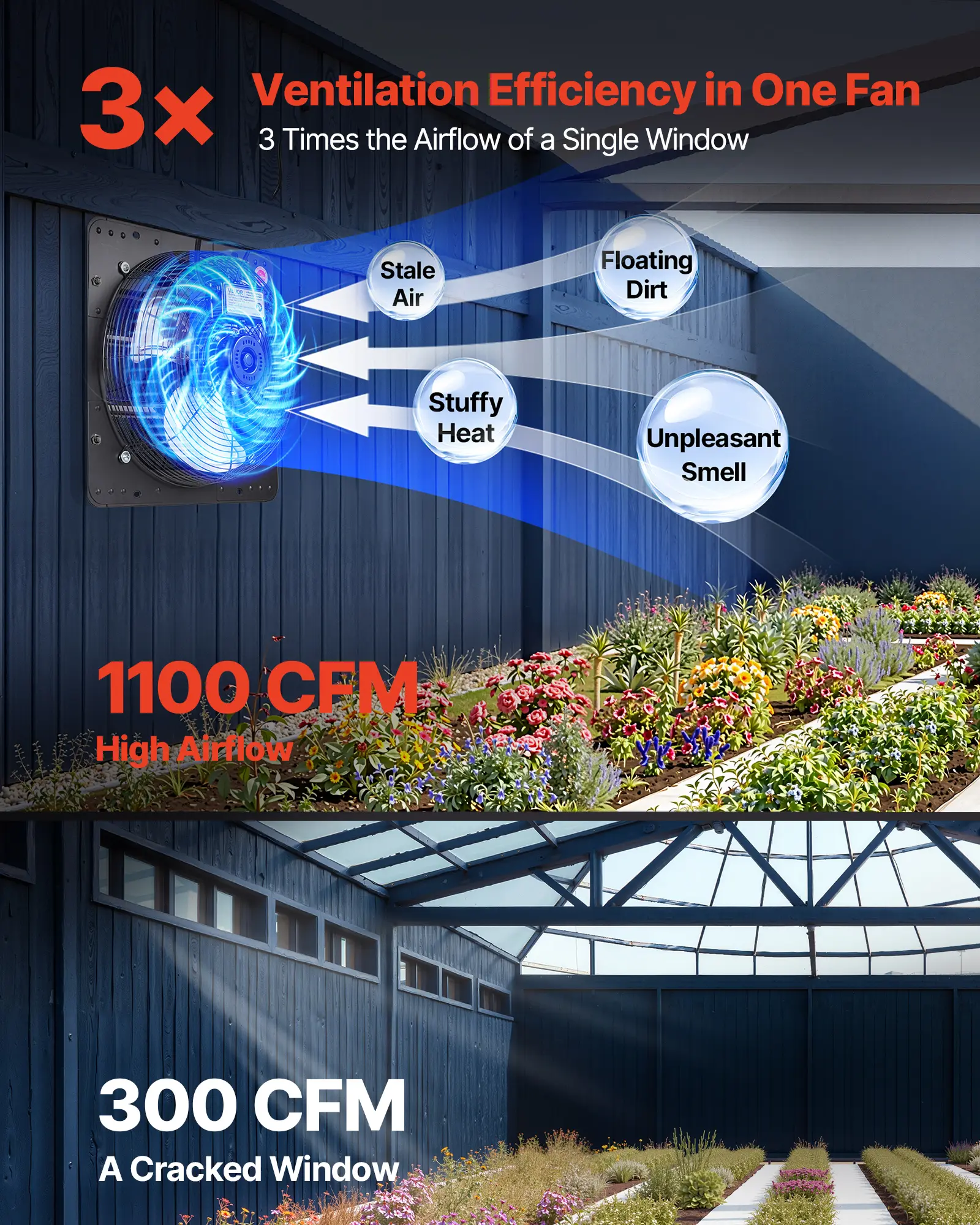 Rapid Venting: This shutter exhaust fan delivers 1100 CFM to quickly expel stale air, floating dirt, heat, and bad smells, keeping indoor air fresh. Also works as a high-airflow exhaust fan for sheds and workshops