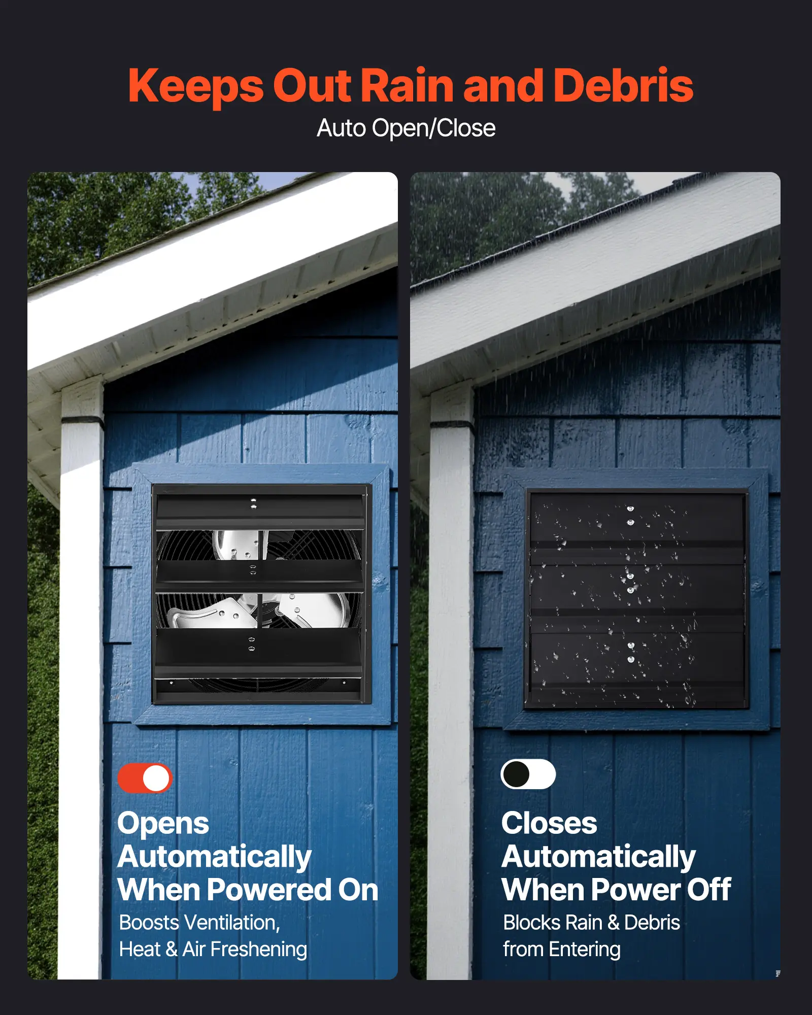 Rain Guard: Shutters open when powered for ventilation and deodorizing, then close when off to block rain and small things, reliable protection for an attic exhaust fan setup