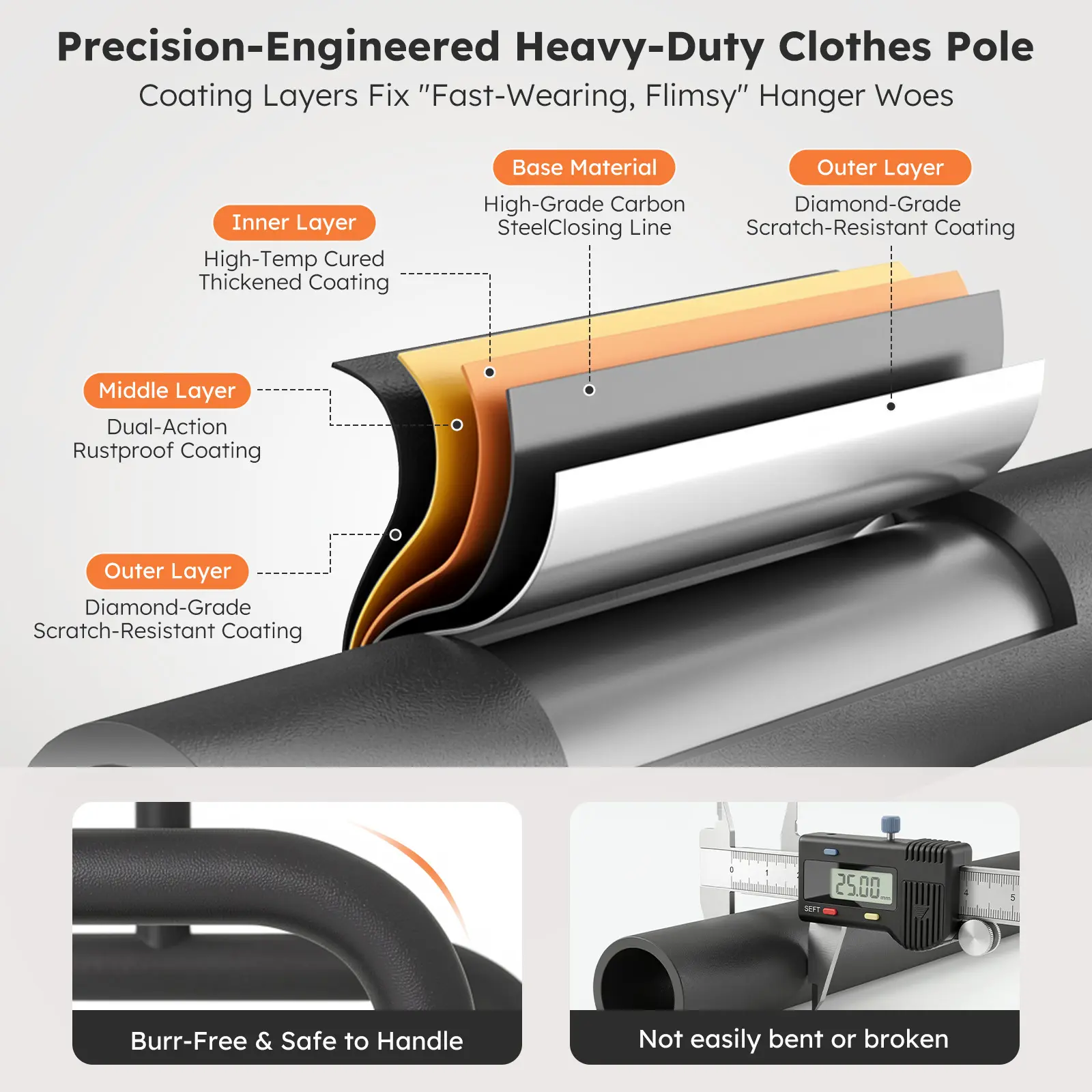 ·Heavy-Duty Metal Frame: This heavy duty clothes rack features a 1.57-inch (40mm) oval hanging bar paired with a 0.98-inch (25mm) thickened frame tube of the metal garment rack, distributing weight more evenly for far better bend resistance than round tubes. As a reliable heavy duty garment rack with a proven 460-lb weight capacity minimum, Even when loaded with heavy winter coats and puffy down jackets, this sturdy clothing rack stays rock-solid—no need to worry about bending or deformation at all.
