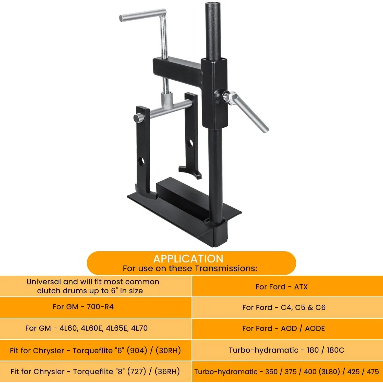 Application:This professional tool is designed for various common clutch drums up to 6" in size.It's widely applicable for transmission repair for Chrysler, GM, Turbo and for Ford models.Special - Adjustable for most transmission types, Similar to Atec Trans-Tool T-0158-HD.Feature - Clutch Drum Spring Compressor, Long legs for deep drums, Mounts on work bench or vise.High Quality - Made of superior material steel which have an unparalleled lifespan with great durability.Adjustable Enhances Versatility:The innovative adjustable feature allows adaptation to various transmission types. Its universal makes it an ideal choice for both repair shops and DIY enthusiasts.