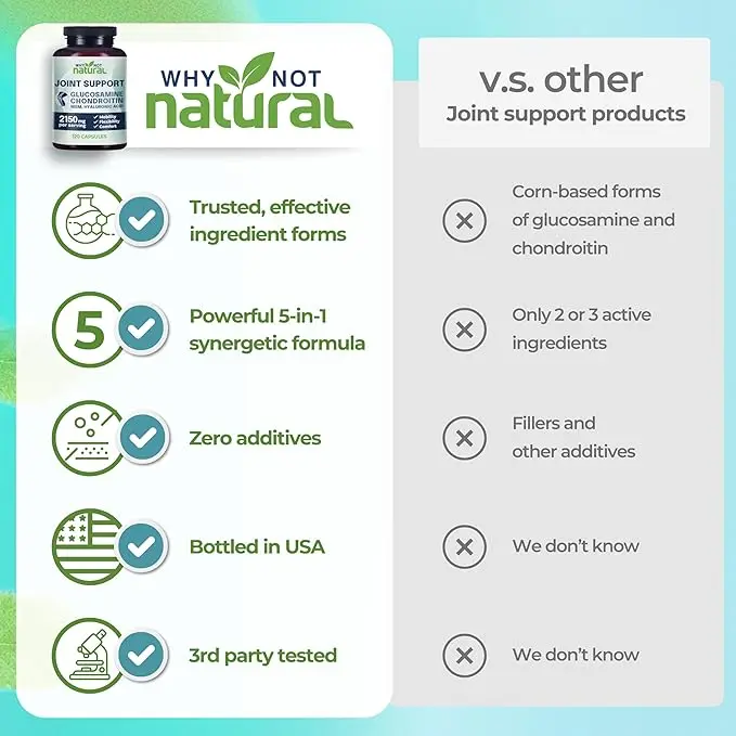 Natural Joint Support Glucosamine Chondroitin MSM, 2150 mg high-efficiency formula, no fillers, supports joint mobility, flexibility, and comfort, 120 vegetarian capsules