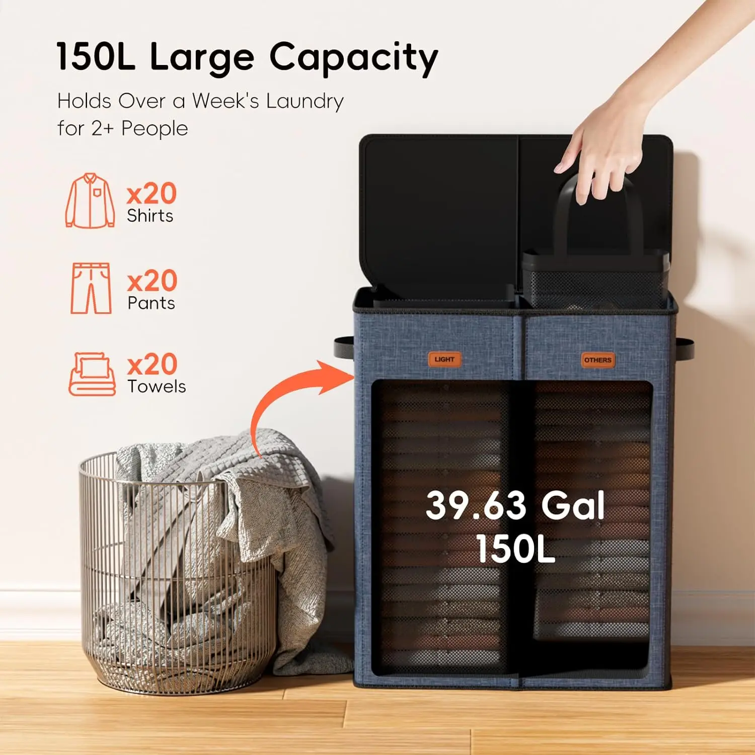 ·150L Large Capacity with Two Compartments: Its dual compartments, featuring removable laundry bags, allow for easy separation of darks and lights or adult and child items. Measuring 23.23" L x 14.17" W x 27.95" H, this dual laundry hamper offers a generous 150L of storage. It helps reduce laundry frequency by holding a week's worth of clothes, bedding, or towels.