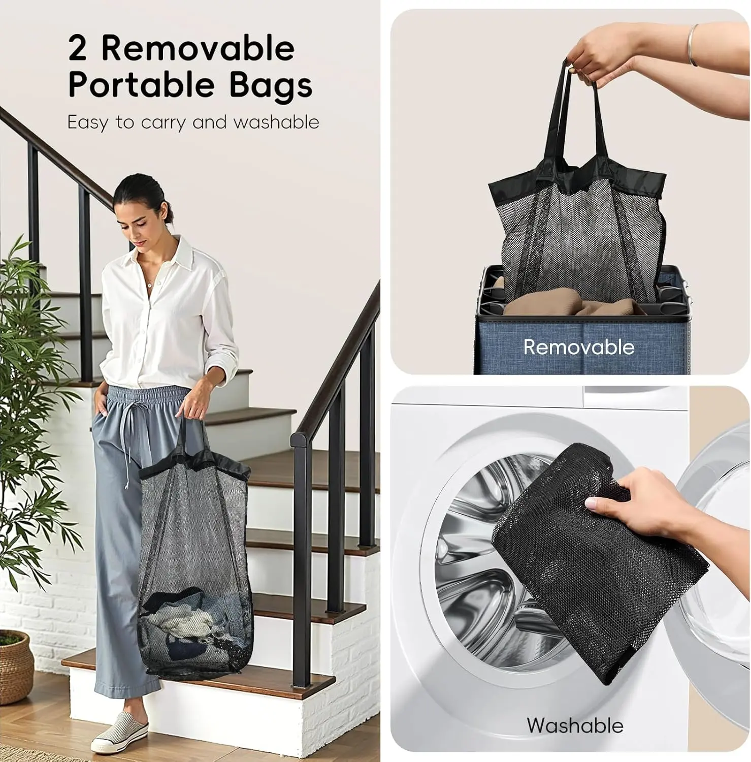 ·Comes with two removable inner bags—simply lift the bags to transport laundry without moving the entire basket, saving time and effort.
