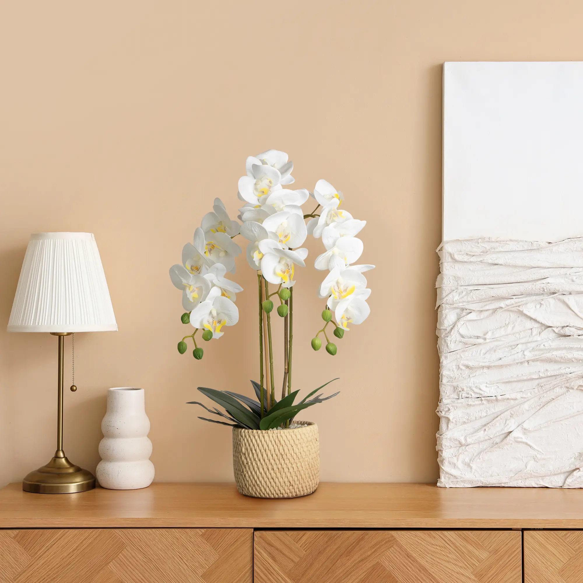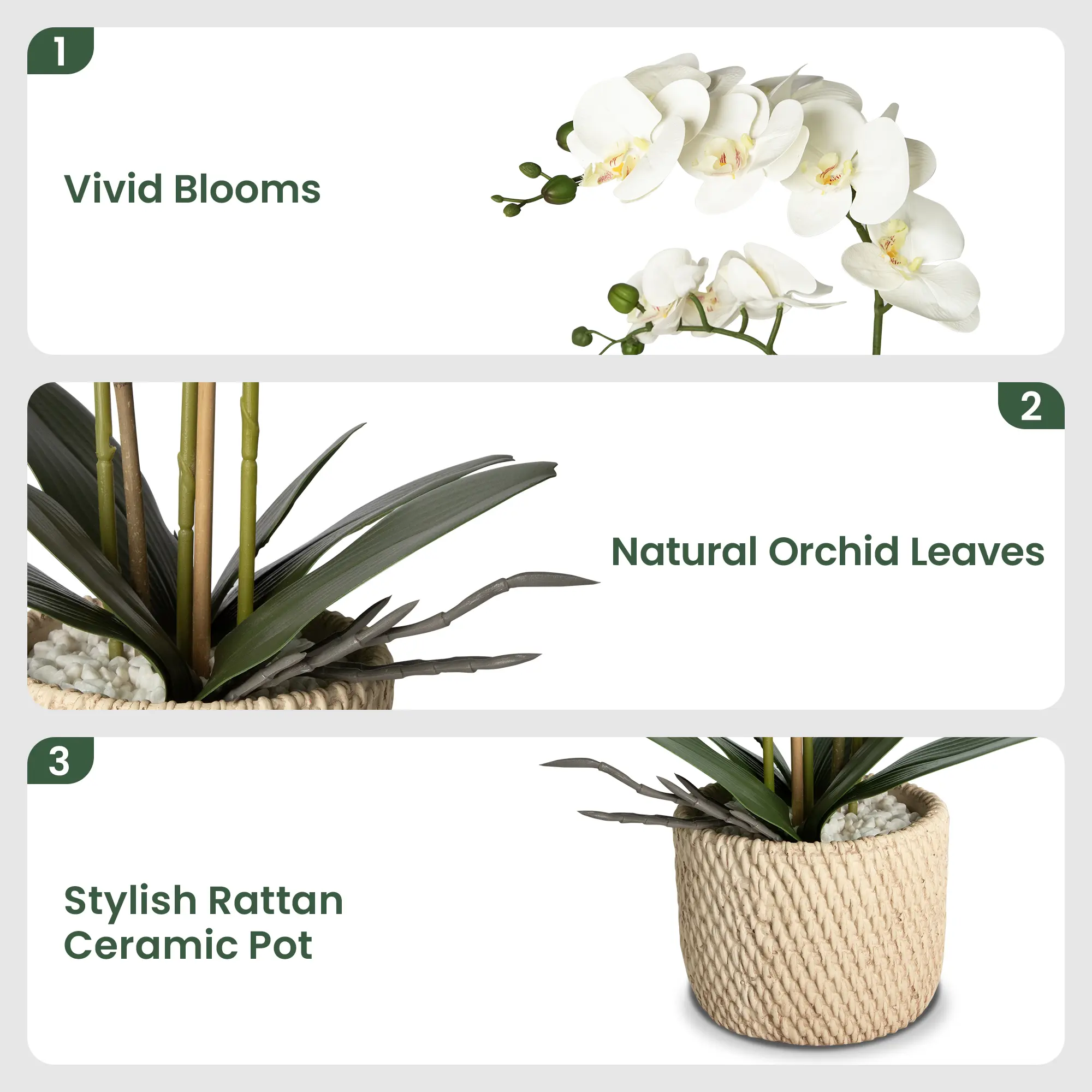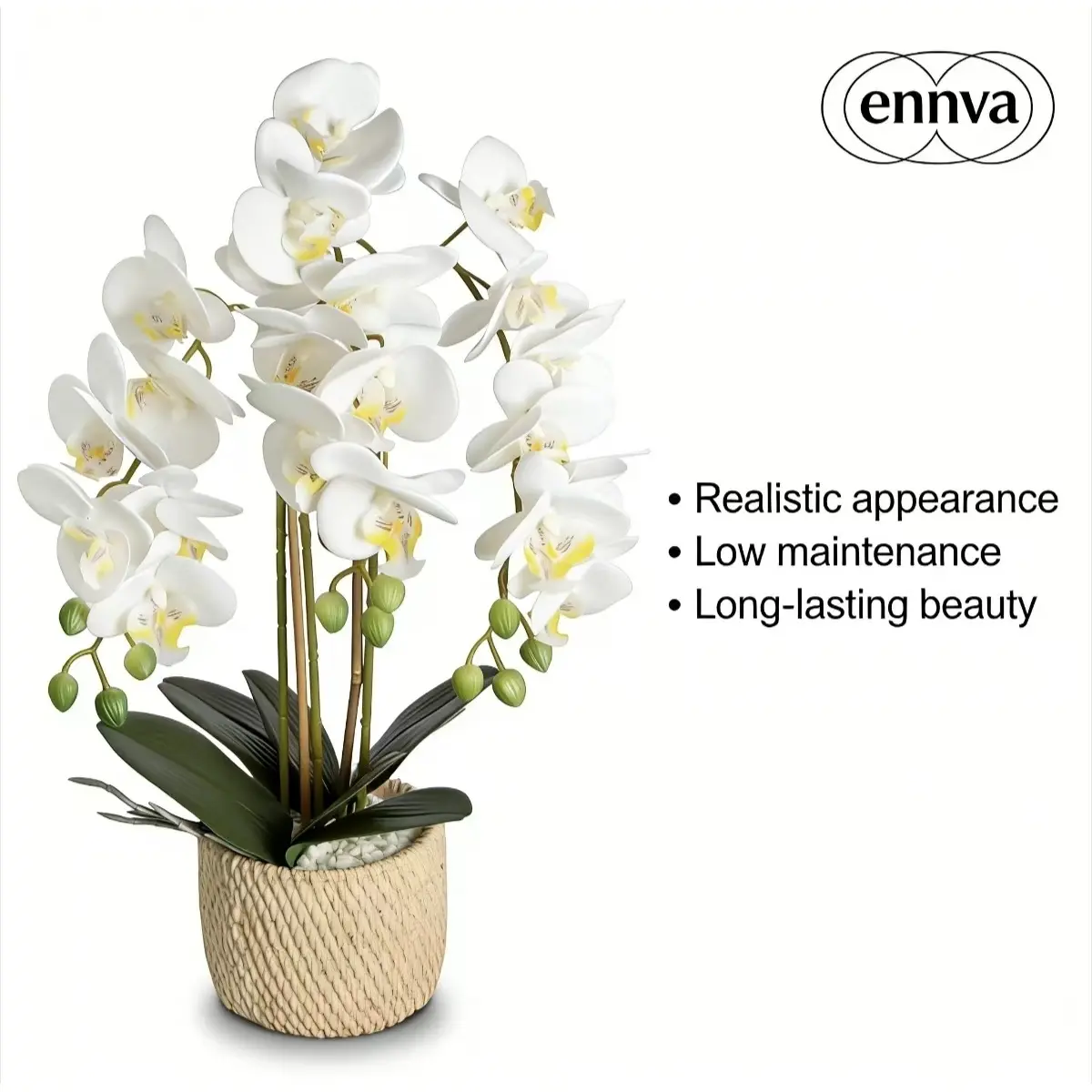 Decorate your home or office with these beautiful, realistic white artificial orchids (in ceramic pots).The realistic white phalaenopsis artificial flowers perfectly match the high-quality ceramic vases, presenting a stylish and sophisticated look that suits any space