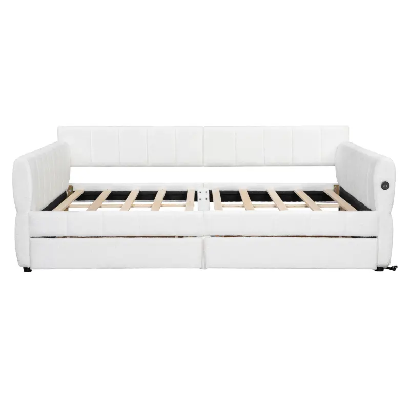This platform bed frame comes with lambswool and is designed with a clean silhouette and a hue of elegance.It suits all styles of home decoration, and completes the look of any bedroom.It includes 2 under-bed drawers for storing spare sheets, clean clothes, games, etc.The left armrest also has a USB charging design.When you are lying on the sofa and your phone is out of power, you can charge your phone in time.