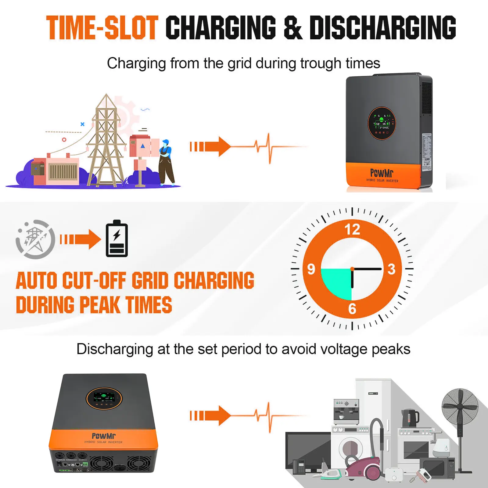 ·【Smart Energy Manager | Peak Shaving | 4+2 Modes】 5000W split-phase solar inverter that comes equipped with 4 Charging Modes (Solar-Only/Grid-Priority/Hybrid/Generator Backup) + 2 Output Modes (Bypass/Inverter). 24/7 Time-of-Use Programming automates charging during off-peak hours (grid/generator) and discharging at peak rates, saving 25%+ on electricity bills. Ideal for off-grid cabins/store backup/emergency power scenarios