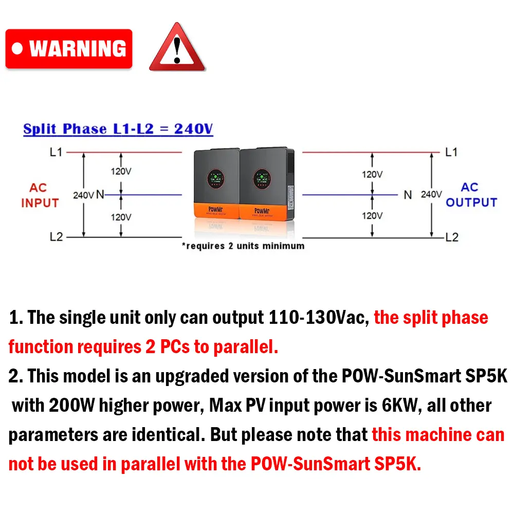 2. This model is an upgraded version of the POW-SunSmart SP5K with 200W higher power, the max PV Input power is 6KW, All other parameters are identical. But please note that this machine can not be used in parallel with the POW-SunSmart SP5K. Thank you!