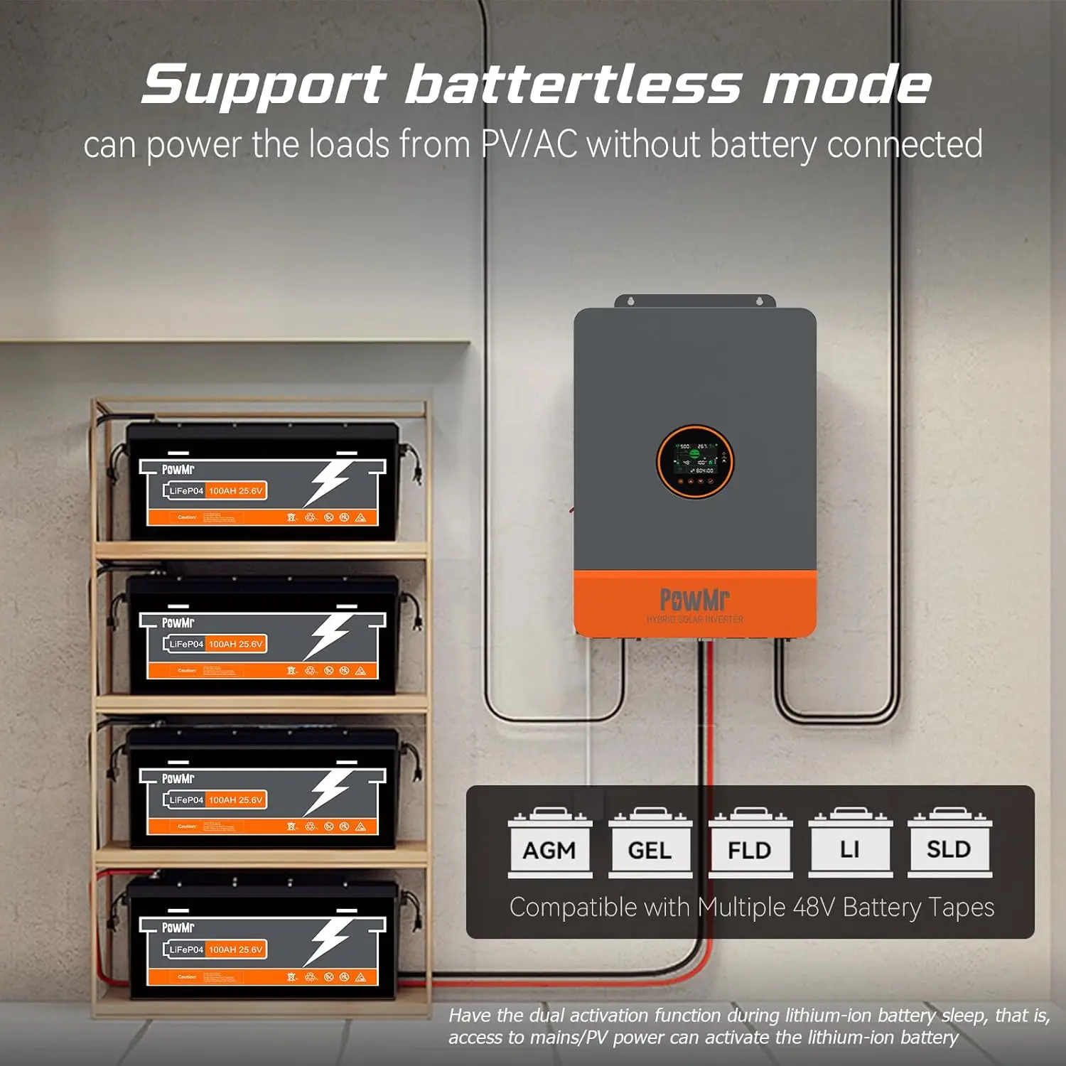 ·【Compatible with Various Battery Types】 This solar inverter supports a wide range of battery types, including AGM, Gel, Lead-acid, Lithium, and LiFePO4. It also offers a Batteryless mode, allowing you to power your devices directly from the solar panel or AC grid without needing a battery. Enjoy flexibility in your energy storage and backup needs. With a dual activation function when the li-ion battery is dormant; either mains /PV power supply access can trigger the activation of the Li battery