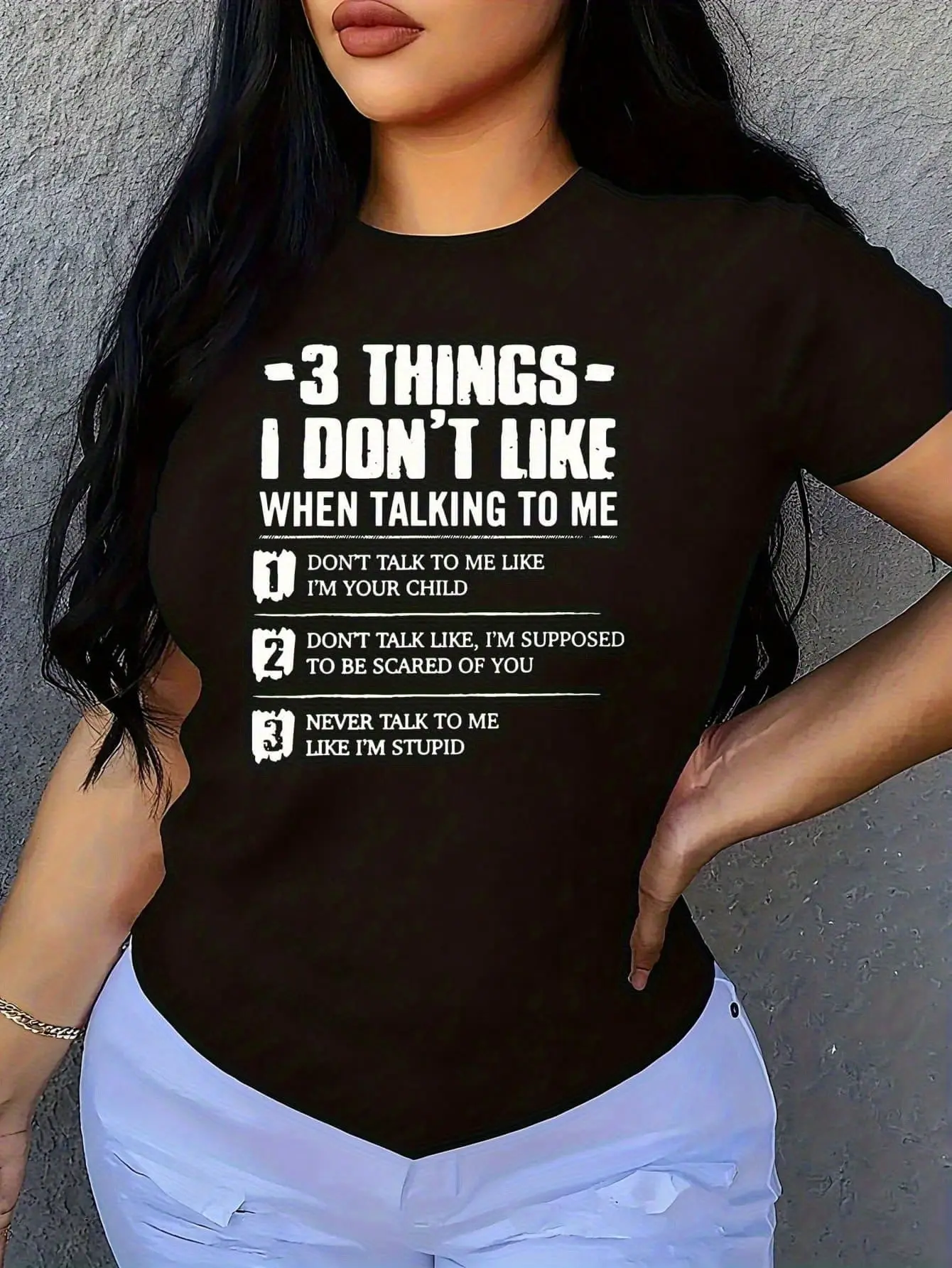 3 Things I Don't Like When Talking To Me 1 Pcs Women's Plus Size T-Shirt Funny Oversized Graphic Short Sleeve Tee Novelty 100% Polyester Shirt Casual Crew Neck Top 220g