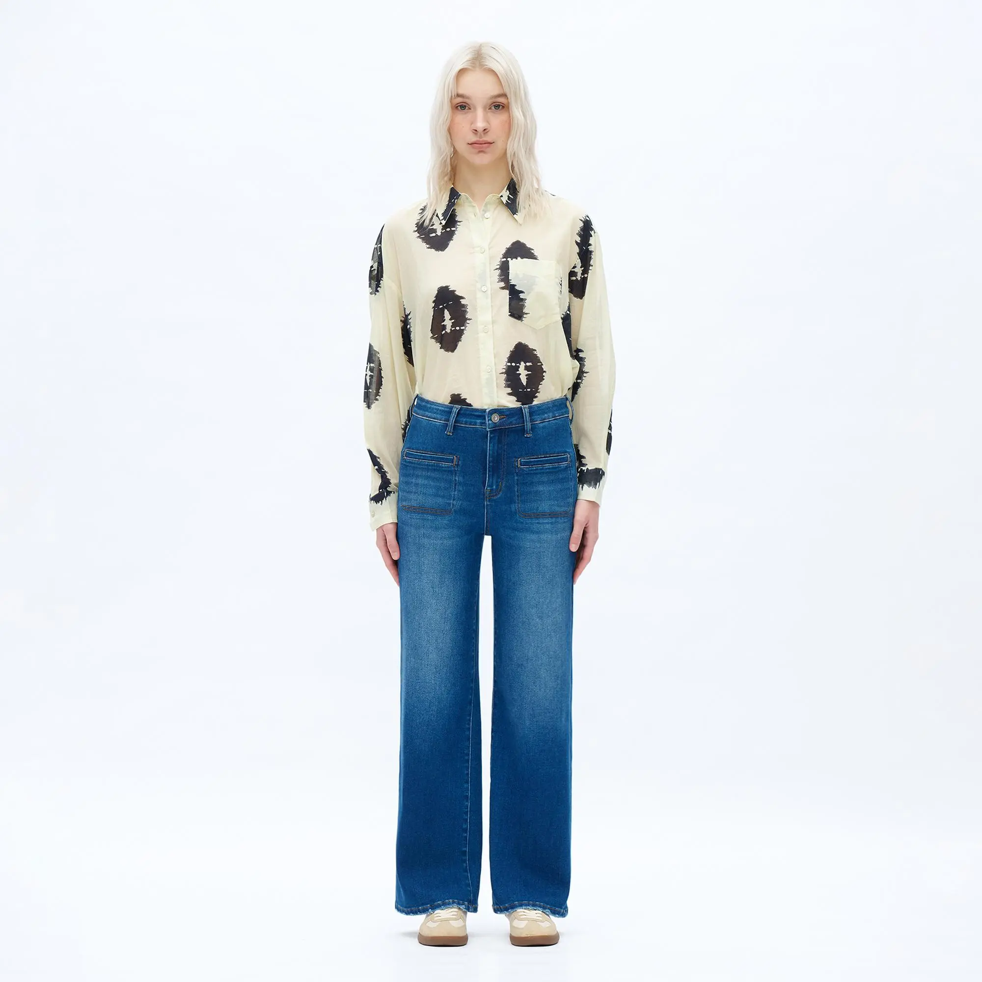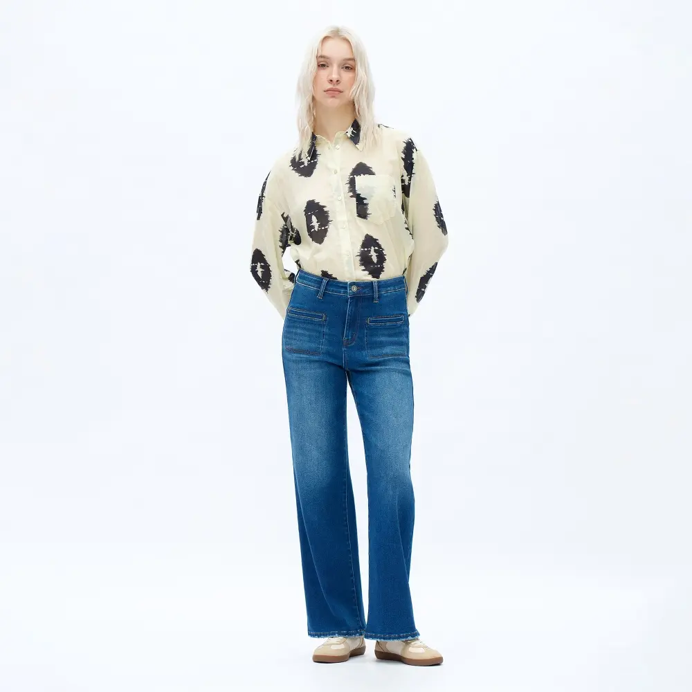 Women’s Retro Medium Wash High-Waisted Wide-Leg Jeans, Straight Fit Denim Trousers with Patch Pockets, Casual All-Season Streetwear m&m