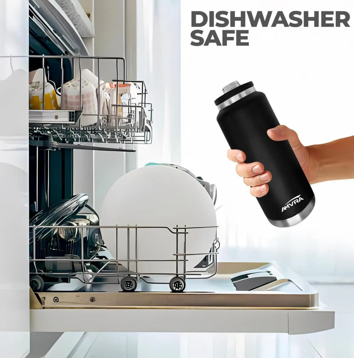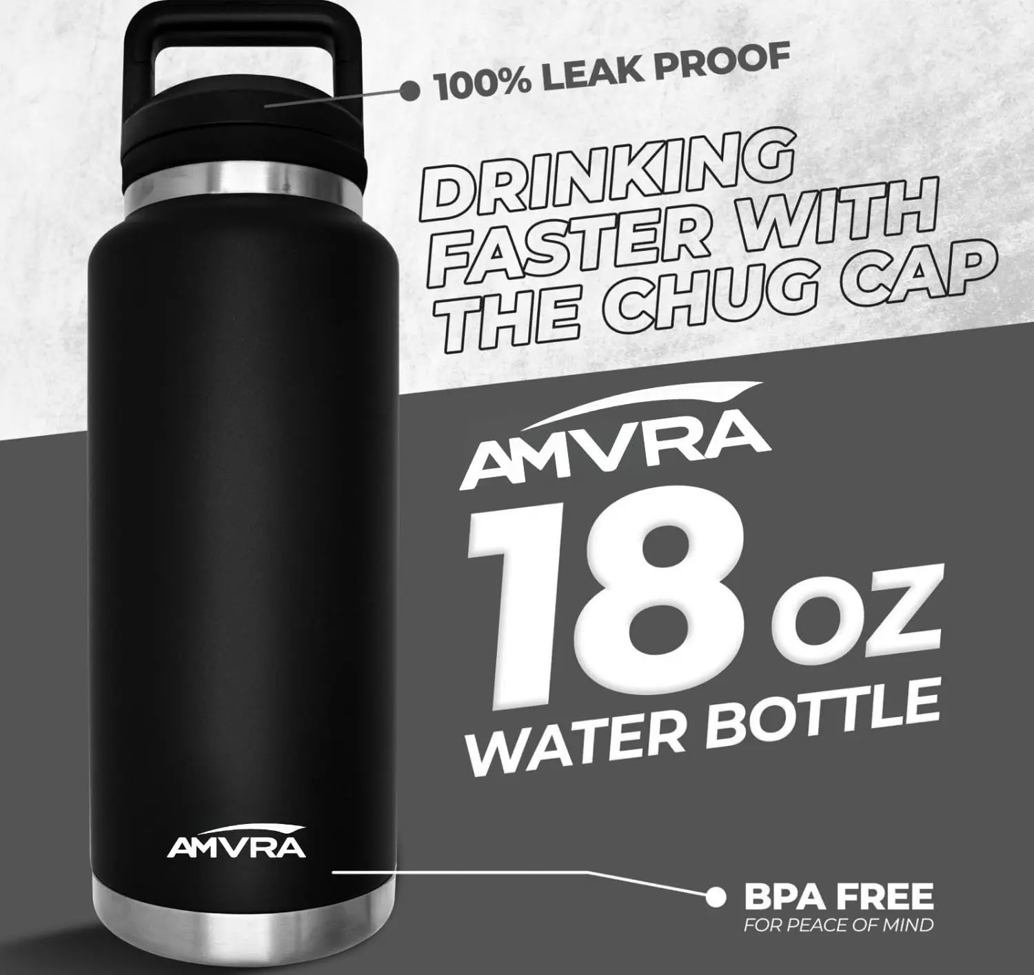 AMVRA Rambler 18 oz Stainless Steel Water Bottle with Chug Cap – Vacuum Insulated, Leakproof, BPA Free – Keeps Drinks Cold 24H Hot 12H – Reusable Travel Bottle, Black