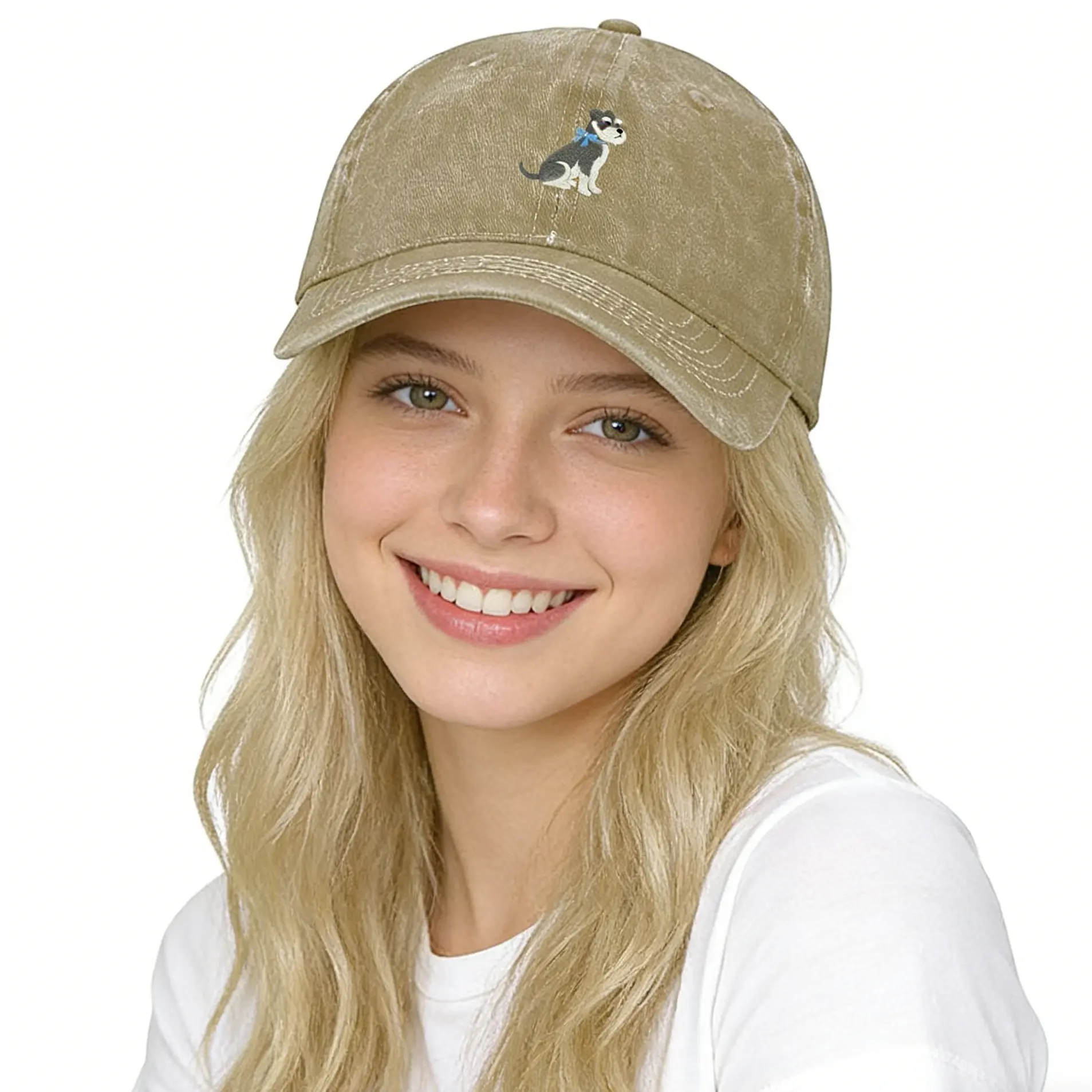 Elevate your everyday look with a touch of preppy charm! This vintage-inspired washed khaki dad hat features an irresistibly cute Schnauzer dog sporting a stylish light blue bow tie. Crafted from ultra-soft, breathable washed cotton, the faded tan/beige color acts as the ultimate neutral, blending seamlessly with any outfit. Whether you are a proud Schnauzer parent or just a fan of the coquette, old-money aesthetic, this hat is a must-have. The graphic is applied using premium DTF (Direct to Film) printing, ensuring vibrant colors and crisp details that won't easily fade.
