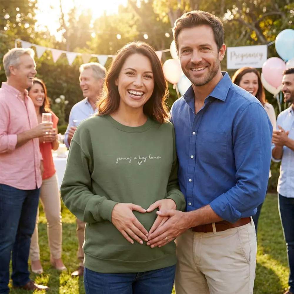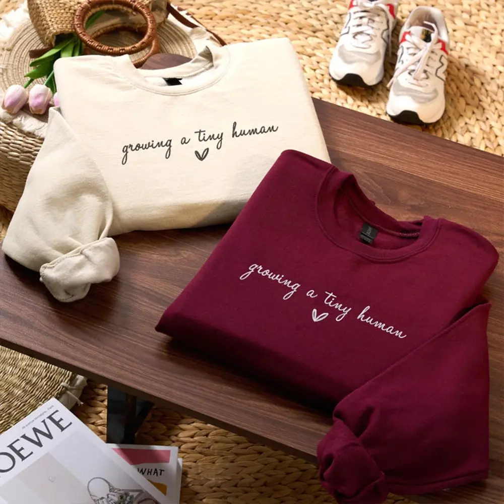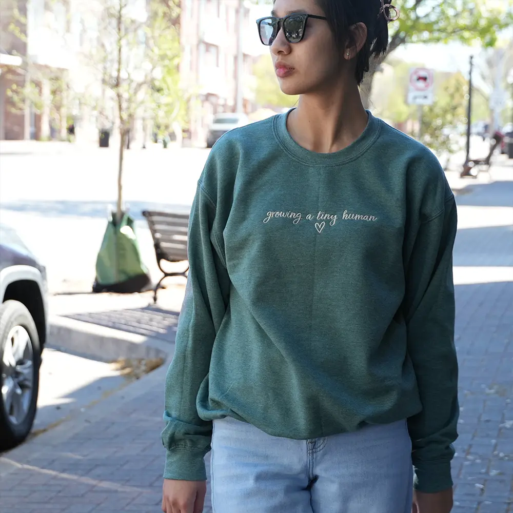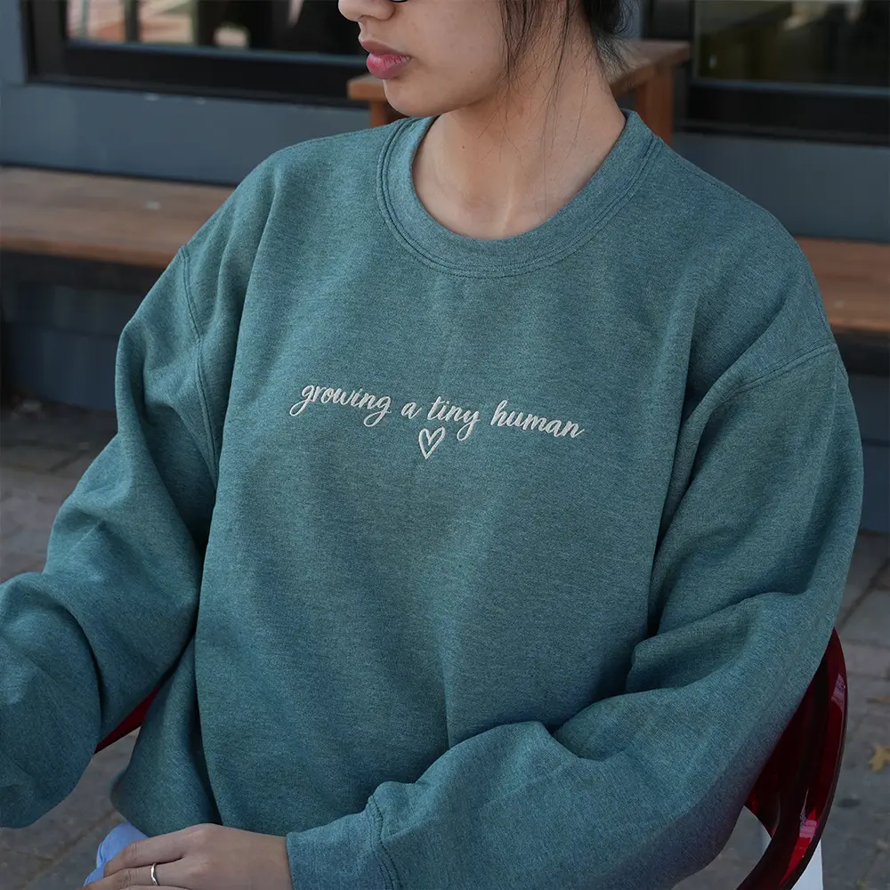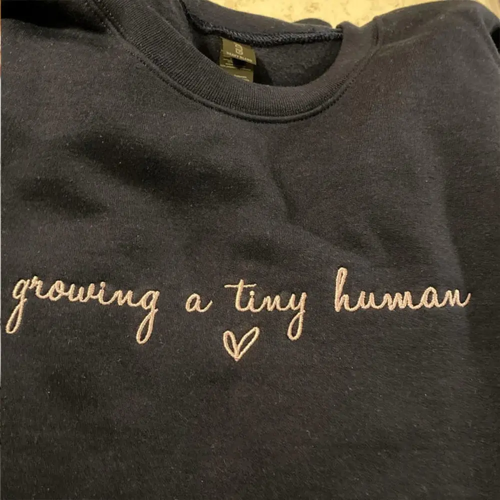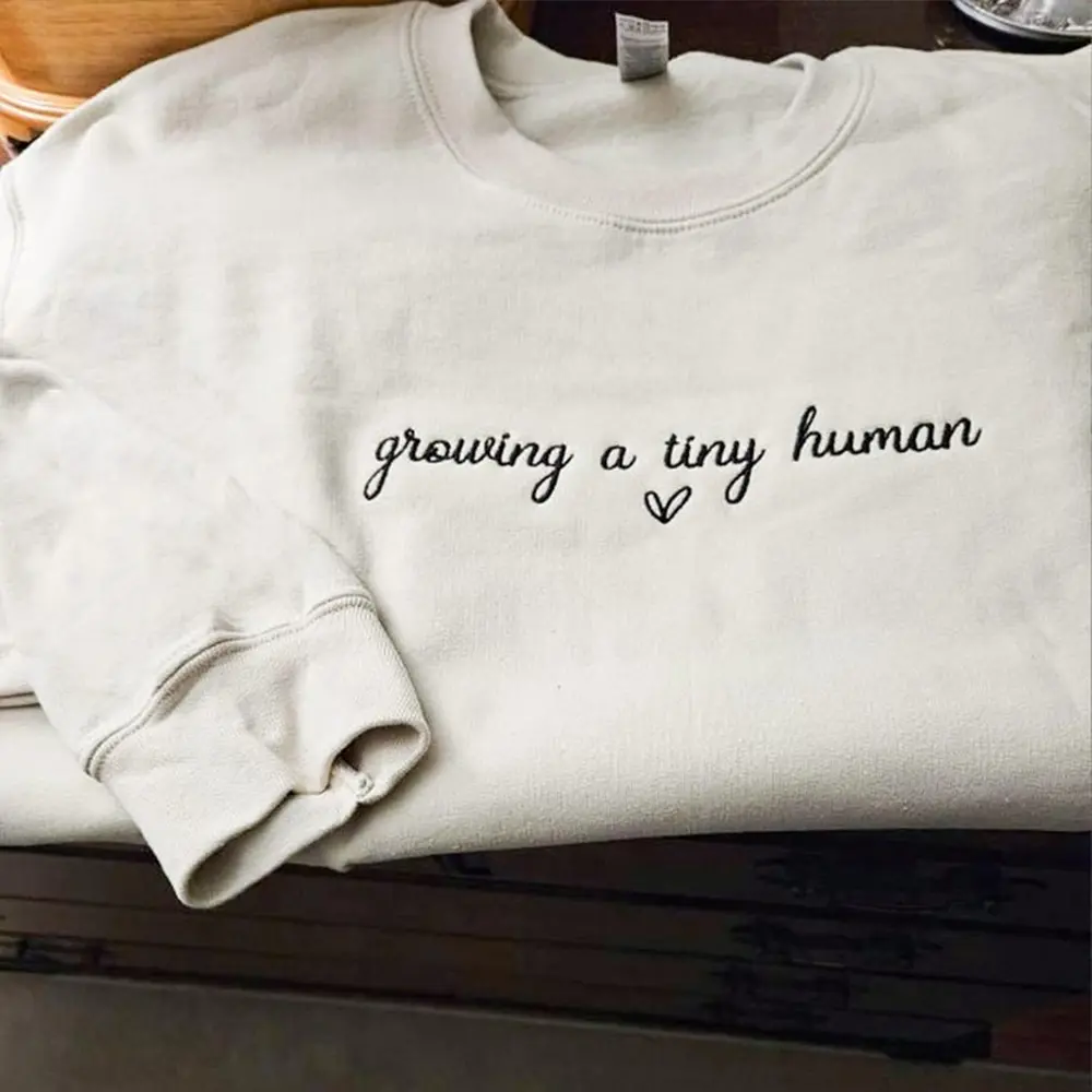 Celebrate the beautiful journey of motherhood with this sweet and minimal embroidered sweatshirt. Featuring the heartfelt phrase “growing a tiny human” in delicate script, this cozy piece is perfect for announcing your pregnancy or simply embracing this special season with comfort and love. Soft, stylish, and full of meaning—it’s a must-have for every mom-to-be.