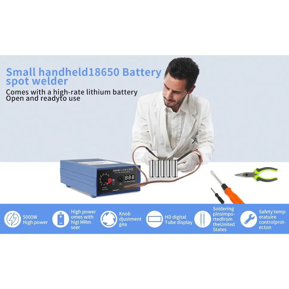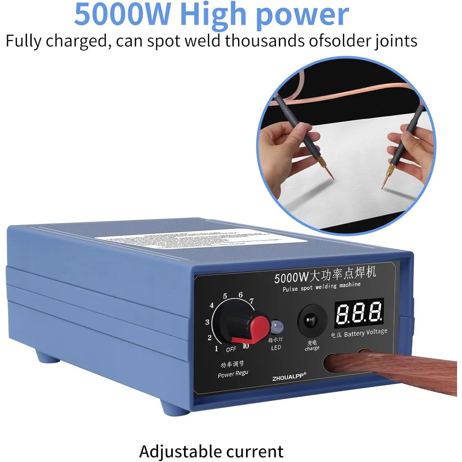💣[Material Is Durable]The 5000W High power spot welding machine is good performance and long service life.Which is ABS shell material, surface anodizing technology, anti-abrasive and safe to use.The spot welding machine is come with welding pen with good conductivity and low contact resistance.🔋[1-9 Level Knob Adjustment]:The adjustable spot welder can weld thousands of points continuously on nickel sheet after full charge,the solder pins of the adjustable spot welding machine can be removed and replaced, easy installation and operation.The mini spot welder with 9 Level output power adjustment design, you can adjust the output power 0-800A by turn the knob, the larger the value, the higher the output.🚀[Easy to Use]:The solder pins of the adjustable spot welding machine can be removed and replaced, easy installation and operation.The DIY battery spot welder machine is foot switch controls welding, spot welding is more arbitrary.Just press the nickel belt with two soldering pens and step on the foot switch.Wait for about 0.5 seconds for output spot welding,then release the foot switch.suitable for precise welding.💌[Warm Tips for Beginner]: This is a small battery pack welding machine suitable for beginners and professional welders.LCD Screen Display,The battery voltage level is the key factor affecting the spot welding effect.Our spot welder screen can display the internal voltage of the product in real time,it is very convenient for you to check and charge in time.The product should be fully charged before first use, please charge when the voltage on the screen falls below 7.3V.📞[Wide Application & Warranty] The spot welder with large output power can be used to connect nickel strips of 18650 lithium battery, or spot welding iron sheets, stainless steel sheets. And it is also suitable for welding 0.1-0.15mm nickel plated steel sheet and 0.1mm pure nickel sheet quickly. In the process of using the spot welder, please feel free to contact us if you have any quest.