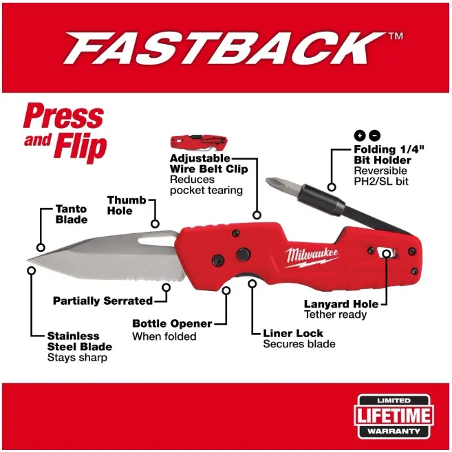 Our FASTBACK 5-in-1 Folding Knife features a press and flip mechanism providing you easy, one-handed opening. The folding knife has a stainless steel blade that stays sharp. The pocket knife also features a liner lock that secures the blade while also allowing you to easily close it when done. The 5-in-1 pocket knife has a folding tanto knife that is partially serrated for versatility, allowing you to both pierce and tear through material. The folding pocket knife also includes a fold-out 1/4" bit holder along with a reversible Phillips #2 and slotted 1/4" bit. It also has a built-in bottle opener providing you with added functionality. The pocket knife has a durable belt clip that reduces pocket tearing and includes a tether-ready lanyard hole.