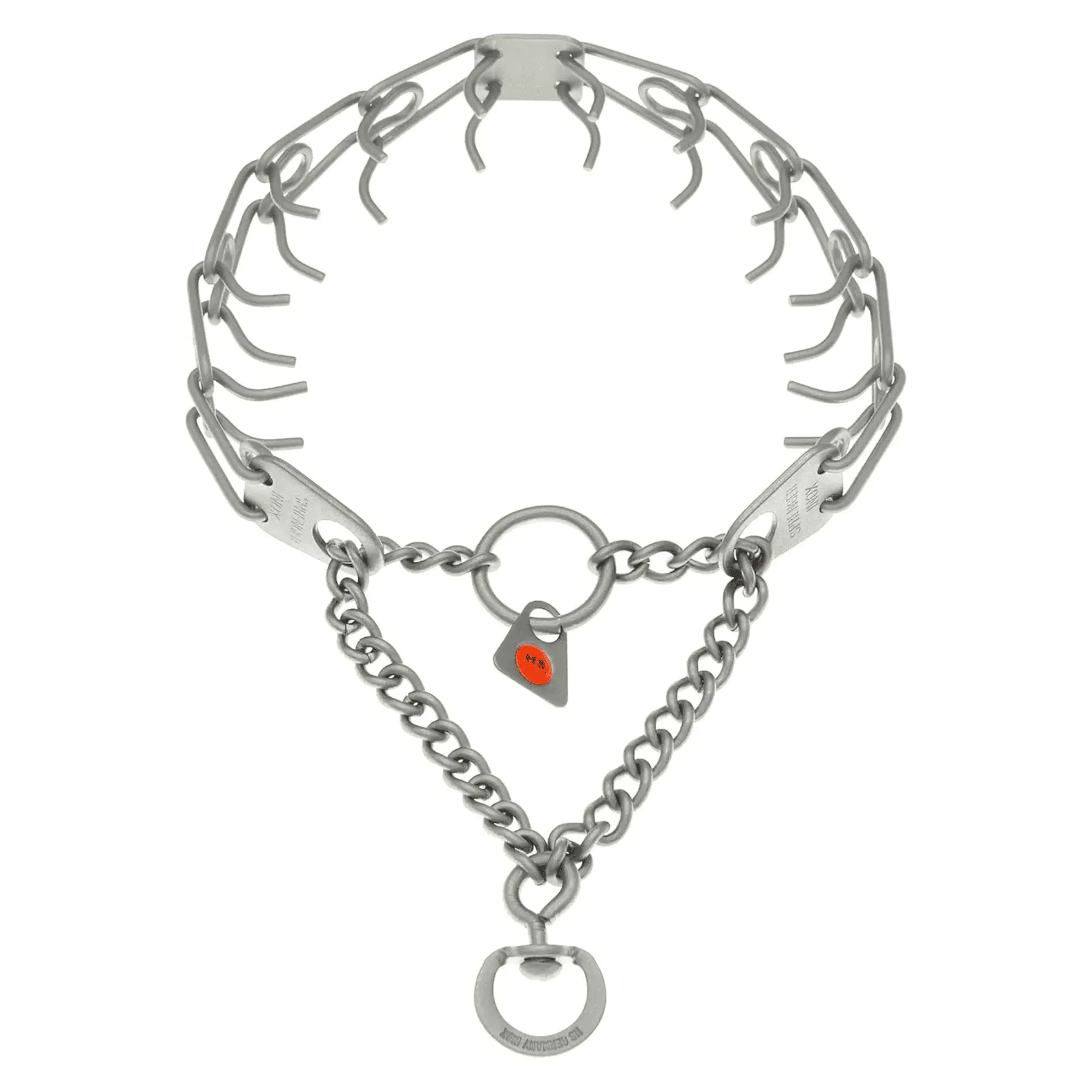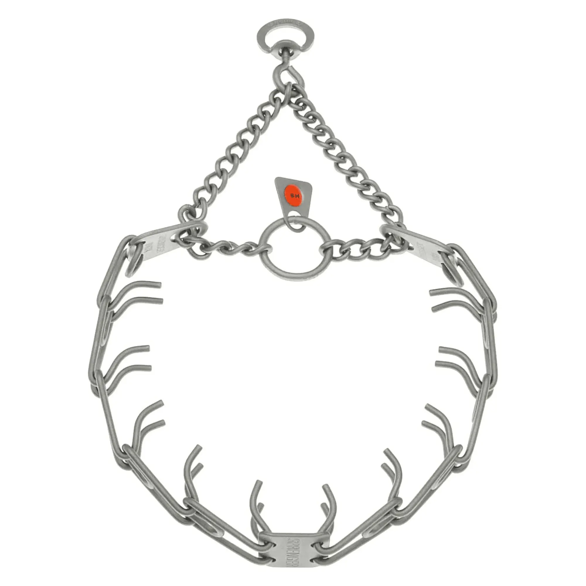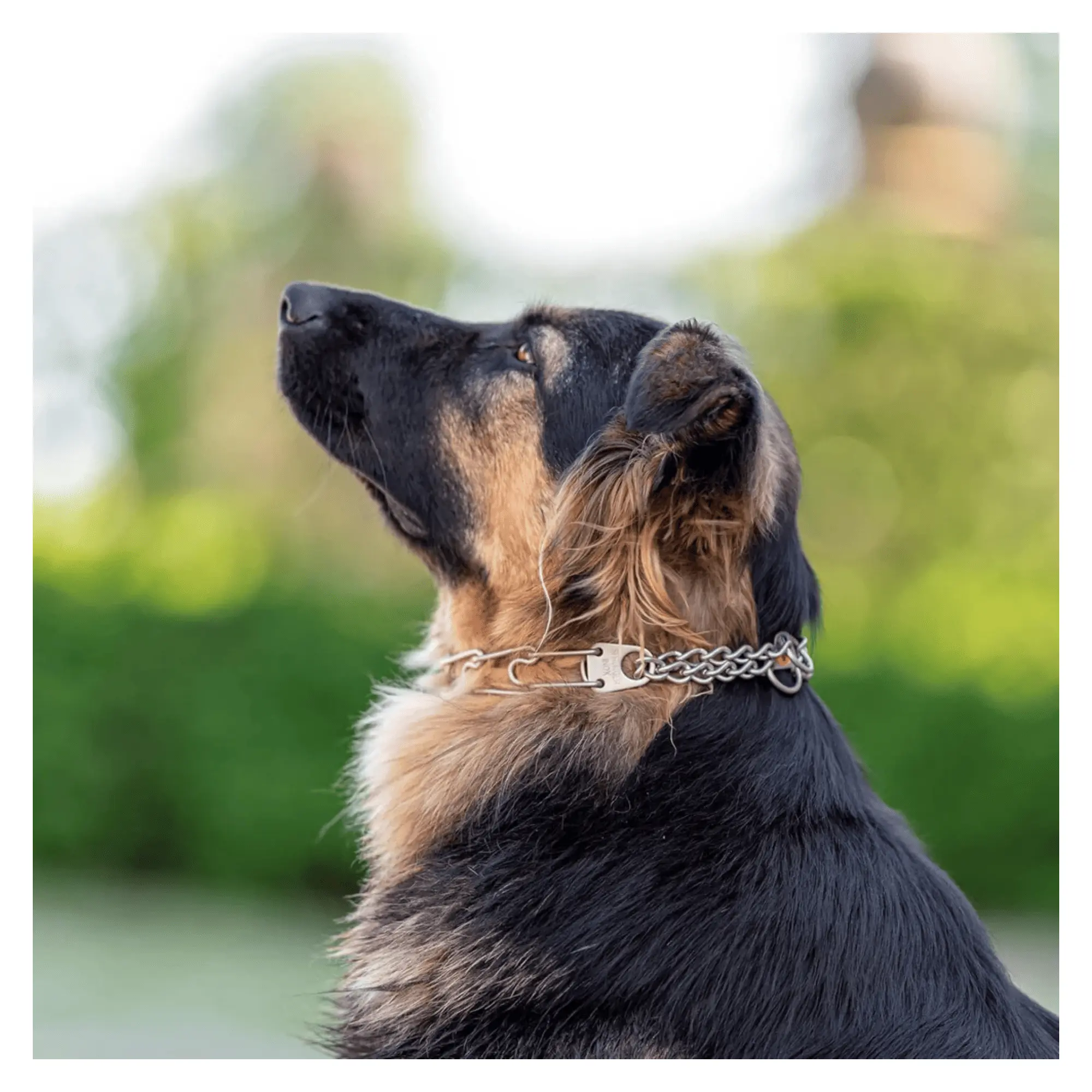Built from rust-resistant and scratch-resistant matte stainless steel, this collar offers a modern, durable alternative to traditional polished or chrome-plated collars. The martingale-style design with center plate ensures balanced correction, making it a trusted tool for both professional trainers and dog owners.